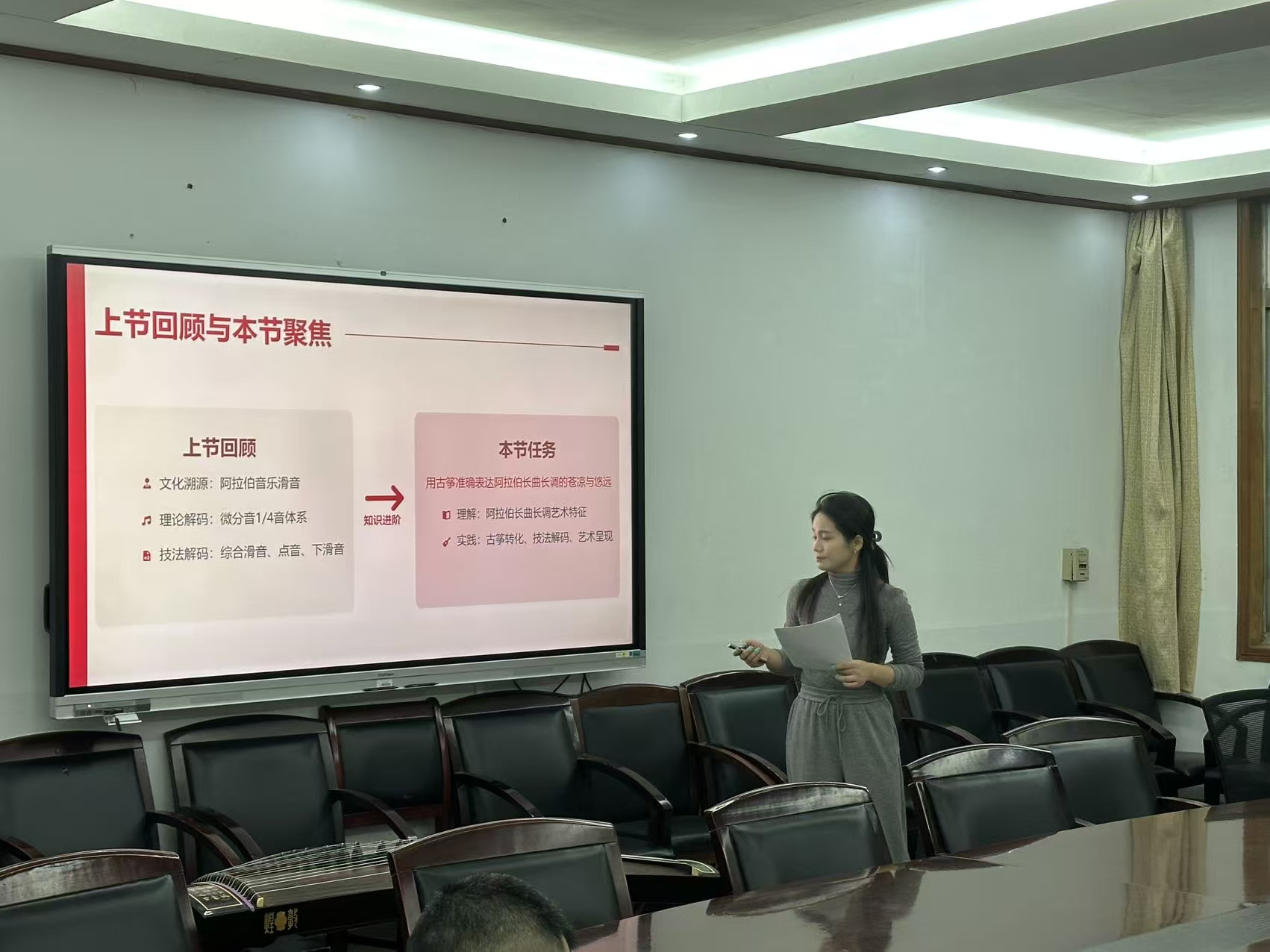 会议聚焦青年教师教学竞赛、教学科研能力提升与学院特色发展等议题进行。会议伊始,舒珊老师就“阿拉伯长曲长调”古筝课程进行了微课教学展示,与会领导和老师针对授课和课件材料短板提出改进意见。会议明确要求建立每周教研活动中增设教师教学展示环节,鼓励教师积极参与信息化教学比赛与优质在线课程资源申报,提议青年教师以校级教研教改课题为基础,逐步积累经验、申报更高层级项目,并强调规范申报流程。