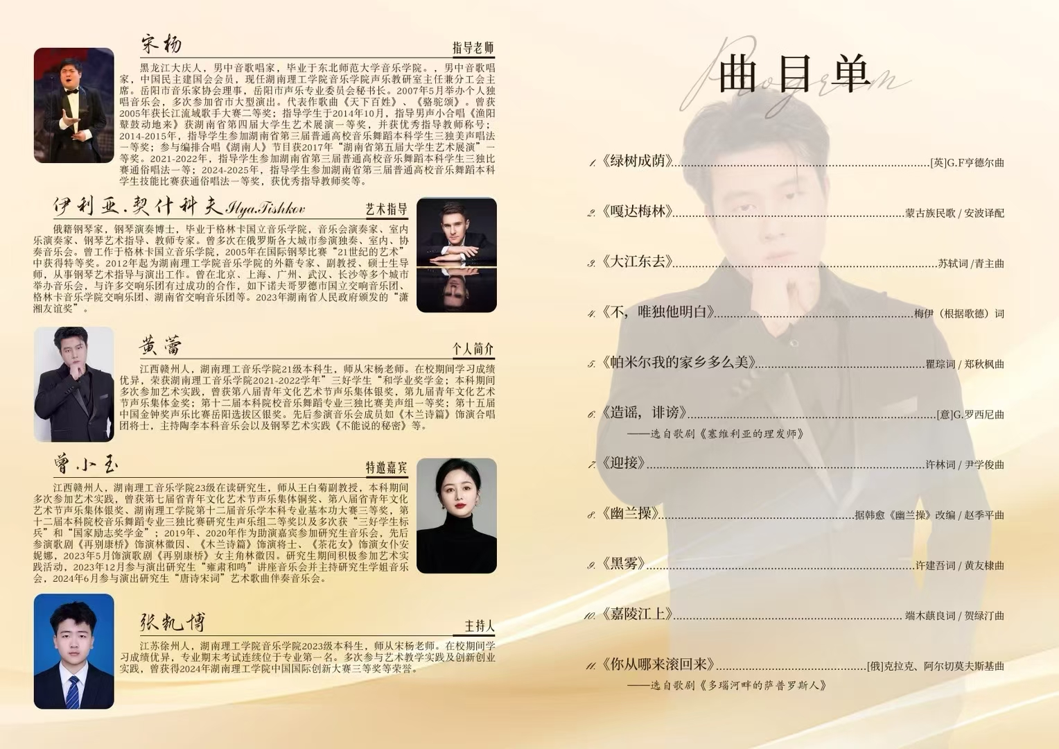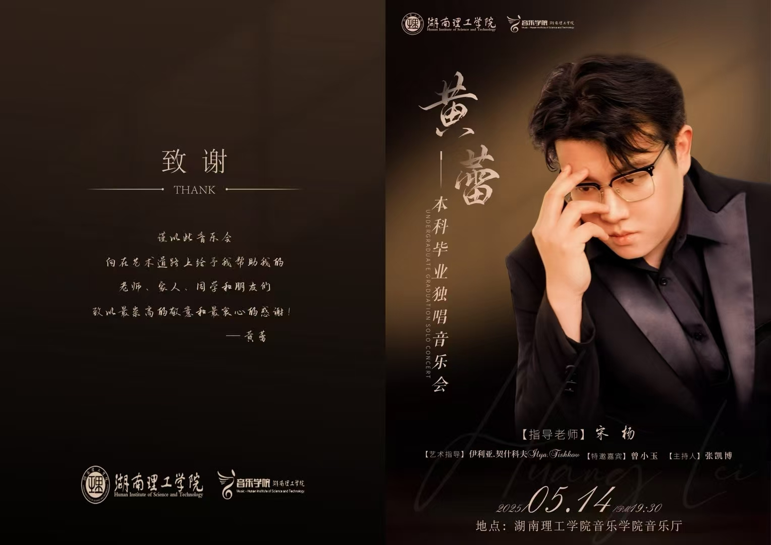 2025年5月14日晚,304am永利集团,304am永利集团2021级本科生黄蕾本科毕业独唱音乐会在学院音乐厅成功举行。本场音乐会由宋杨老师指导,伊利亚•契什科夫副教授担任艺术指导,2023级研究生曾小玉作为特邀嘉宾献唱,2023级本科生张凯博主持。学院部分师生共同聆听了这场精彩的音乐盛宴。