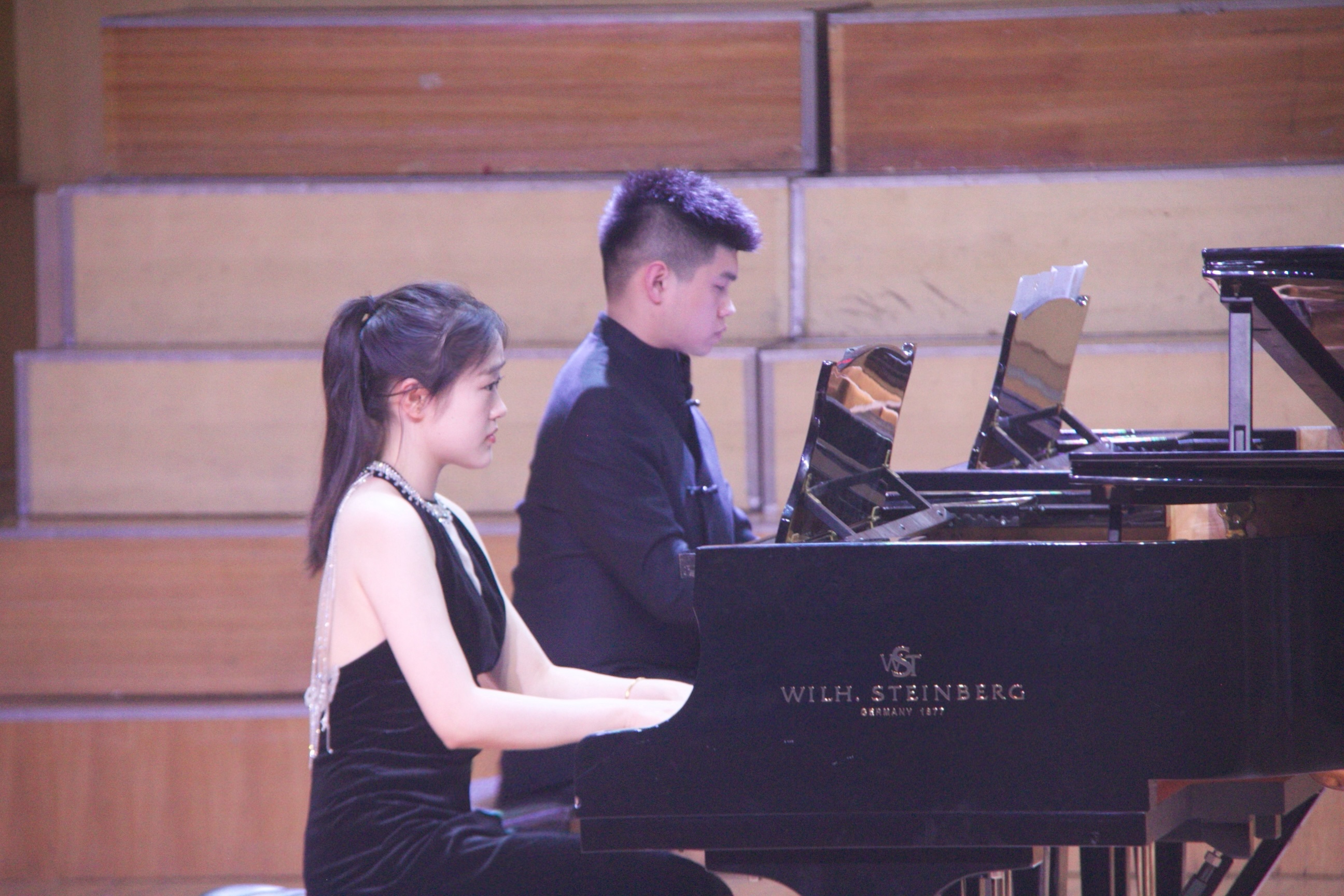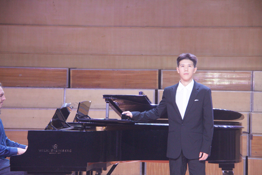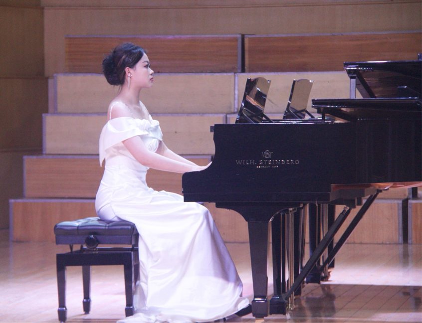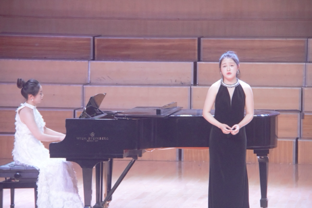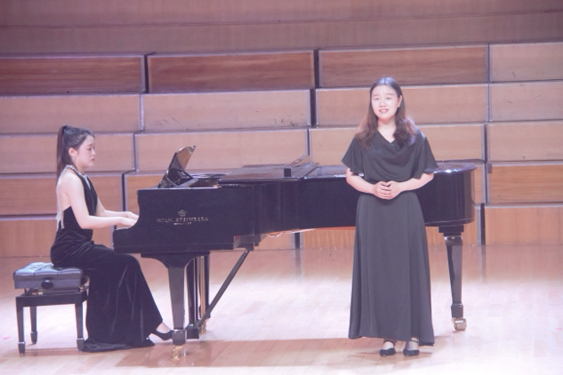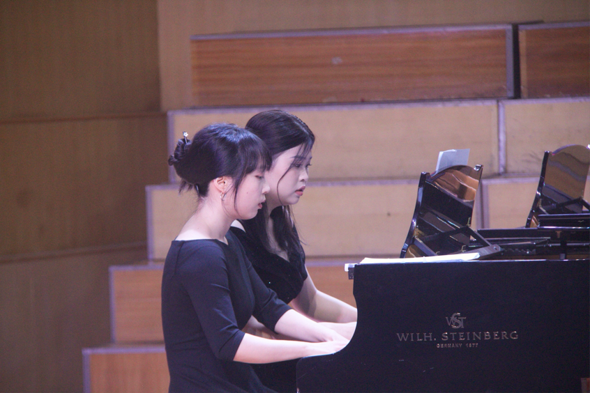 器乐表演环节同样亮点纷呈。杨贵淞与张锦亭在指导老师冯毅的指导下,以雄浑激昂的双钢琴演奏《黄河颂》,将黄河的磅礴气势与民族精神融入黑白琴键之间;包瑞婕带来的海顿《Hob.XVI.50奏鸣曲》第一乐章,以灵动的指法展现古典主义音乐的严谨与优雅;魏新吁、蓝天的四手联弹《动物狂欢节》则以活泼欢快的节奏,用音符勾勒出春日里生机勃勃的动物世界,赢得现场阵阵掌声。