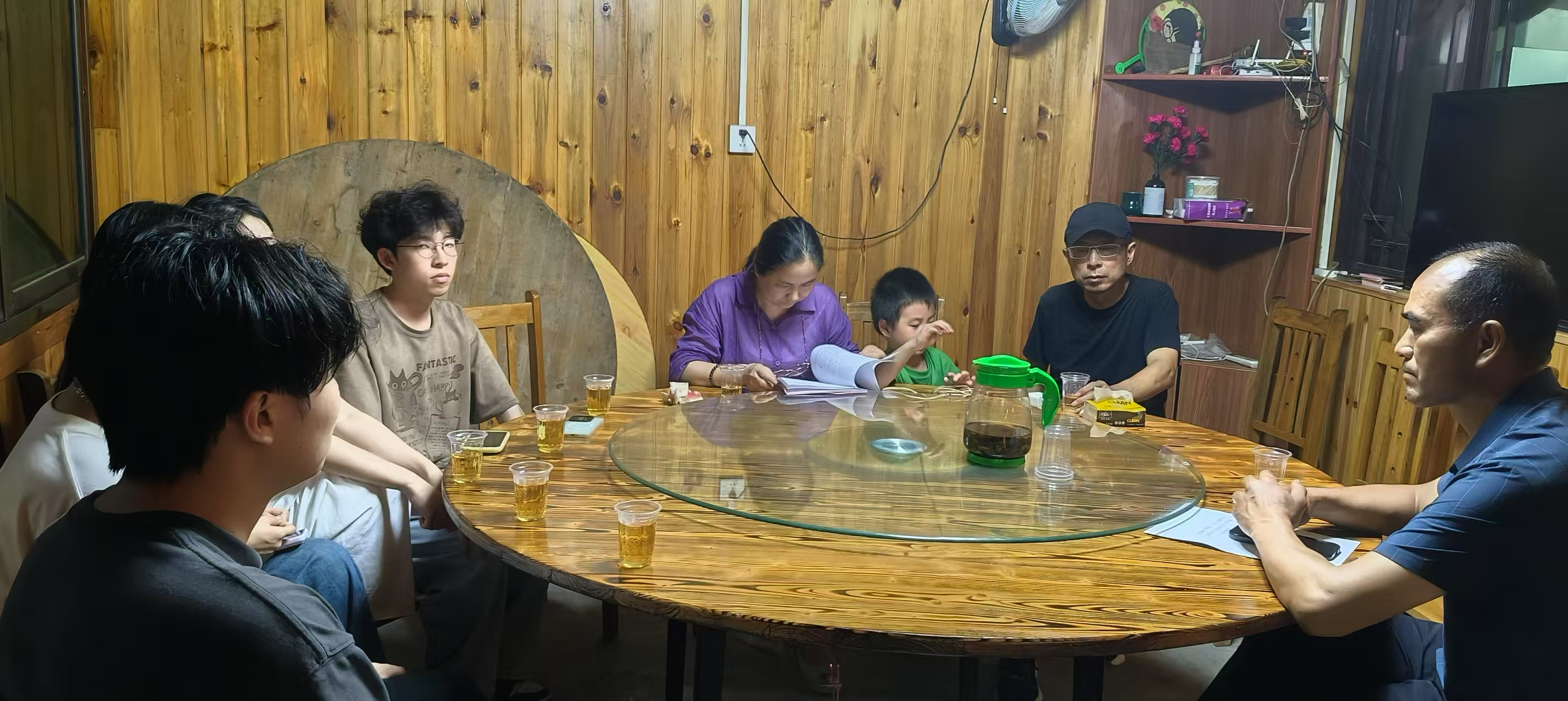 晚上,我们与村支部书记杨进树同志进行了深入座谈。团队成员们认真聆听了杨书记对村情民情的介绍,并就接下来的工作计划进行了亲切交流。杨书记表示:"大学生们的到来给我们带来了新思路,期待通过这次活动让更多人了解我们村的苗族、侗族以及瑶族民族特色文化。"从他们那里,我们详细了解到上堡村在乡村振兴方面的规划和面临的挑战。村里有着丰富的苗族、侗族文化资源,但这些文化瑰宝尚未得到充分挖掘和利用,缺乏有效的市场推广渠道,未能转化为经济优势。在产业发展方面,除传统农业外,乡村旅游也有一定发展基础,但配套设施不完善,旅游产品单一,难以吸引更多游客。