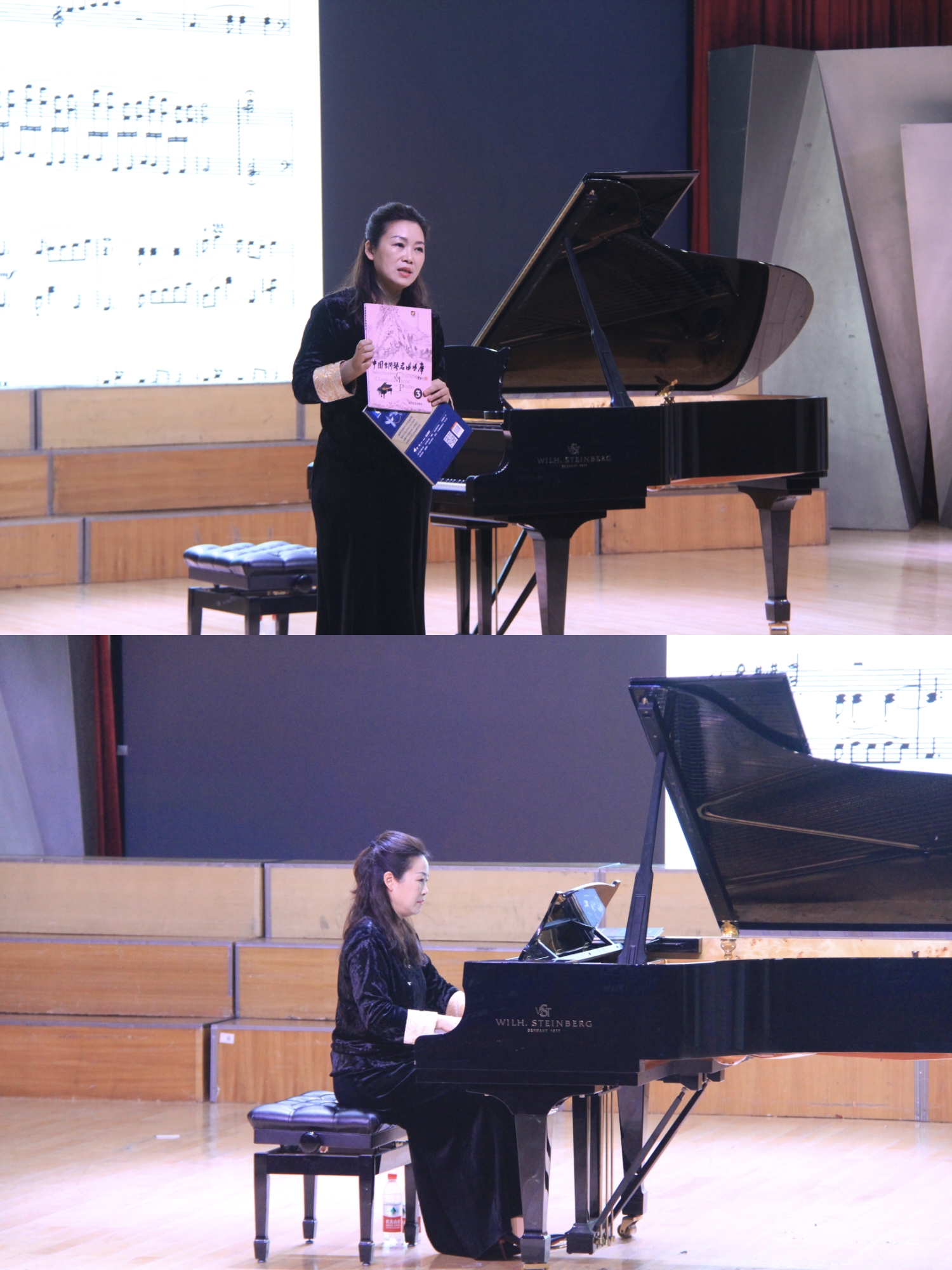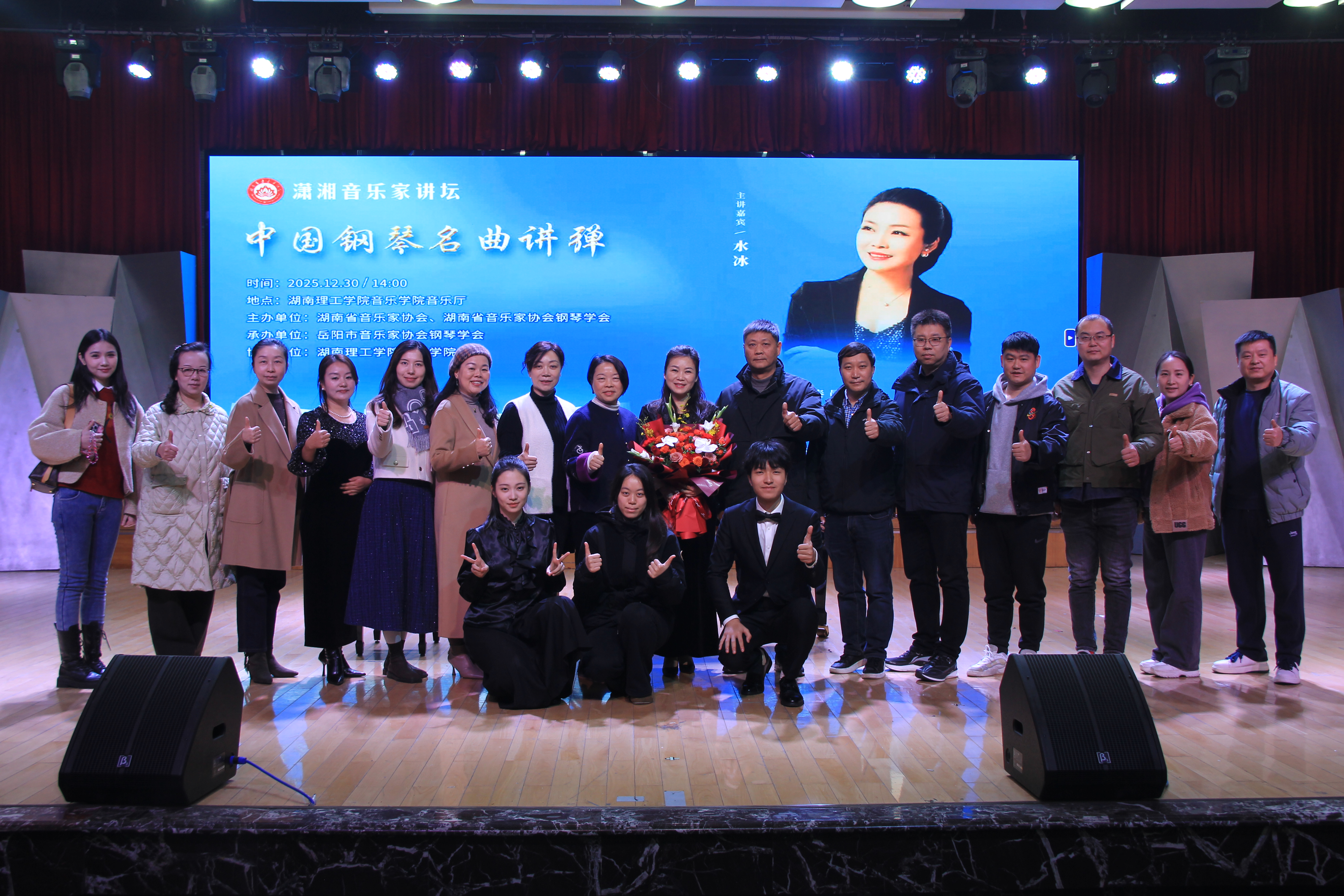讲座尾声,水冰教授倡导师生在研习西方钢琴技法的同时,积极演奏和推广中国钢琴作品,传承中华优秀传统文化,并推荐了《中国钢琴曲集》《钢琴百年经典》等优质教材。作为岳阳籍音乐人,她表达了在家乡高校分享艺术心得的荣幸与欣慰,希望能激发青年学子对中国钢琴音乐的热爱与传承责任感。