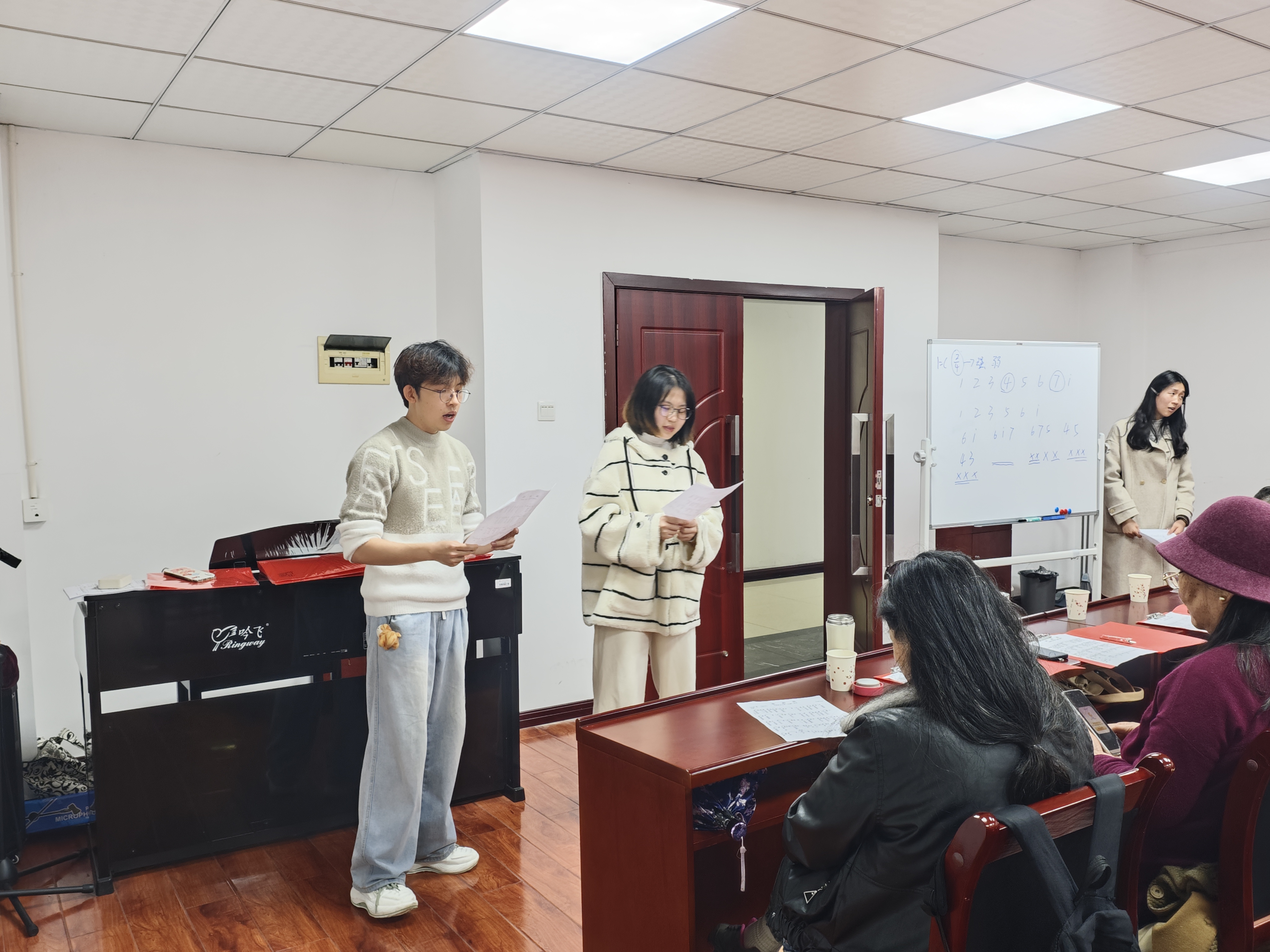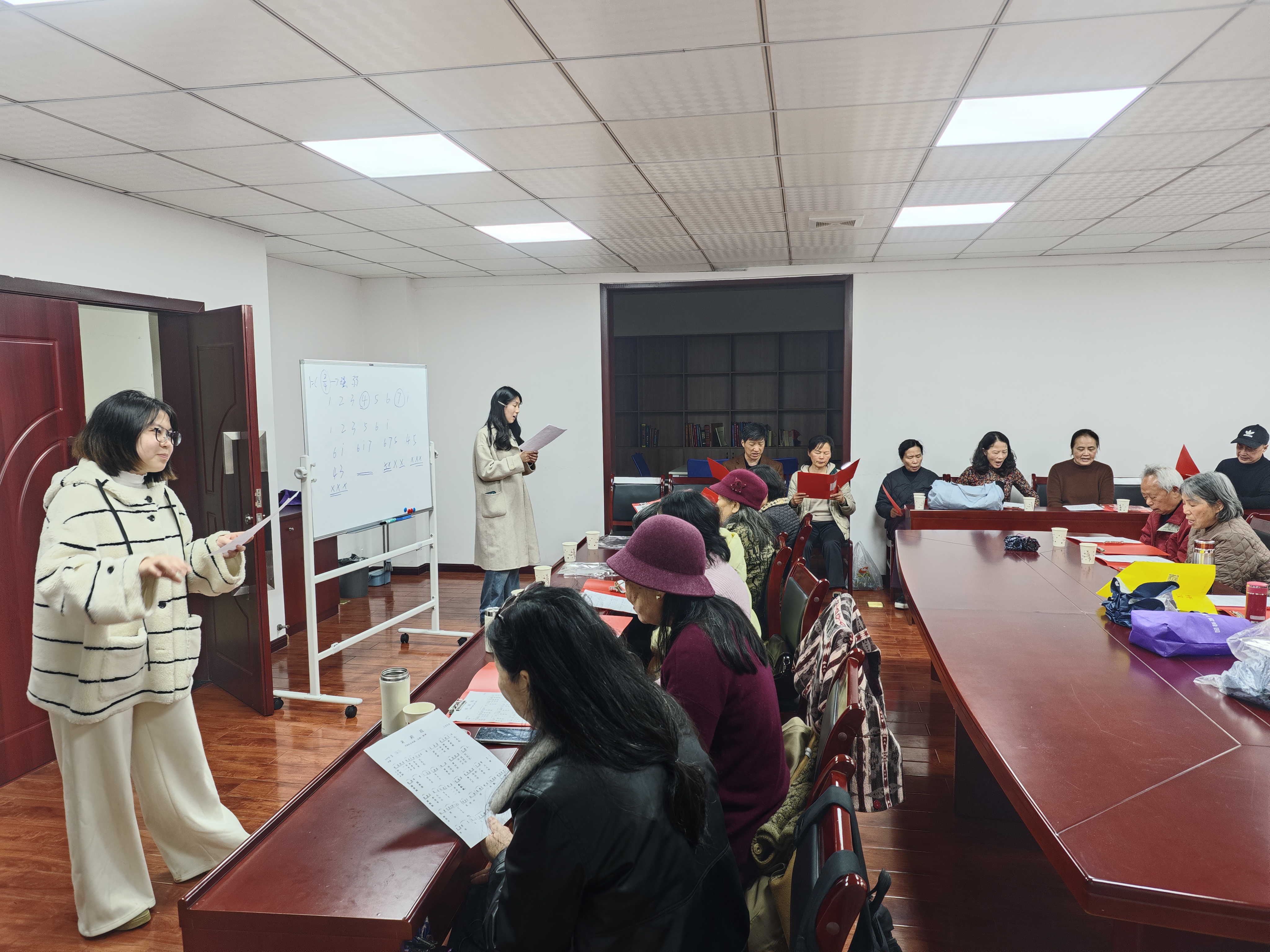 随后,教唱活动正式开始,志愿团队的同学们围绕经典曲目《茉莉花》展开教学,凭借专业的声乐知识,耐心为大家讲解发声技巧、节奏把控与情感演绎。现场氛围轻松融洽,大家认真聆听、积极跟唱,悠扬的旋律在教工之家回荡,青春嗓音与温情歌声交织,尽显和谐美好,也让离退休教职工在歌声中感受艺术的乐趣。