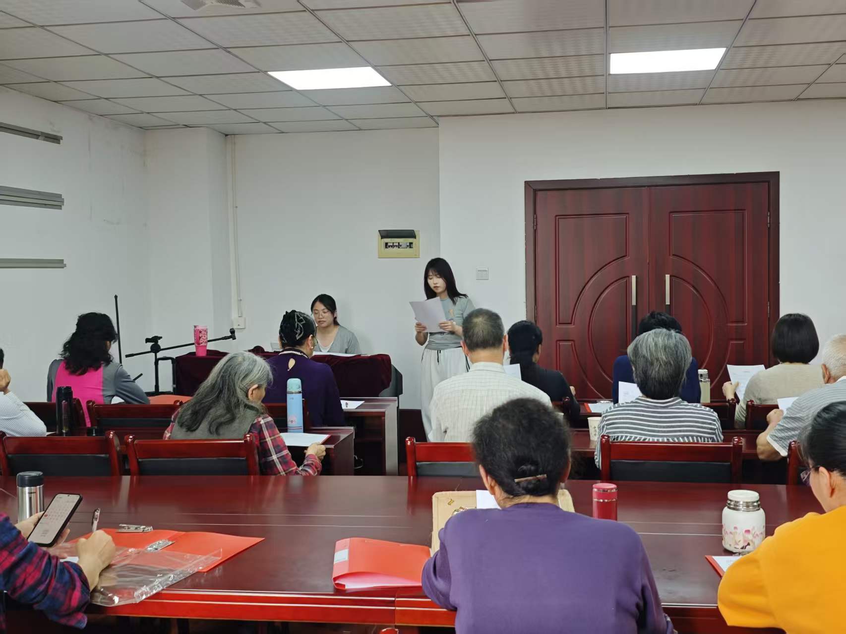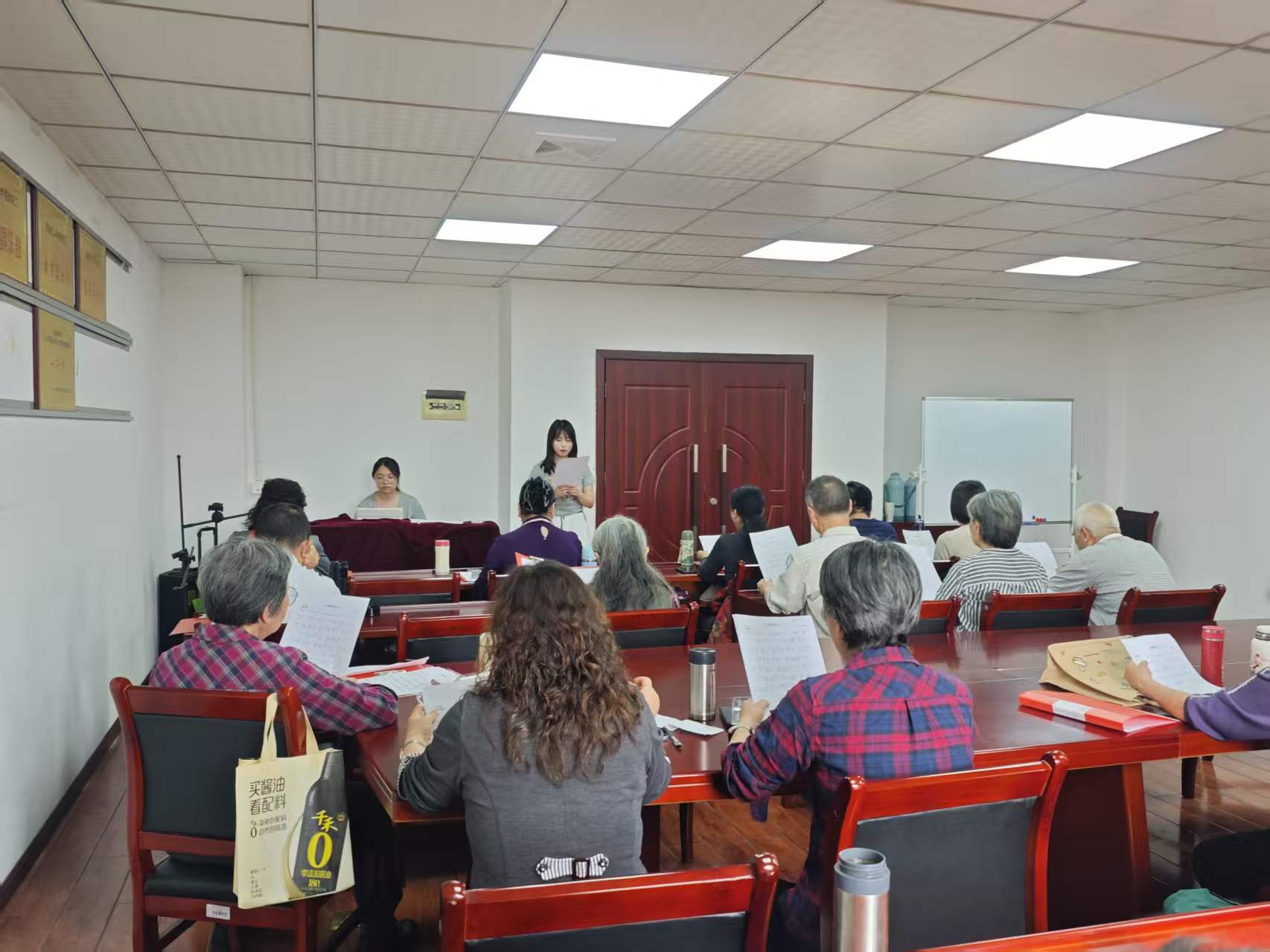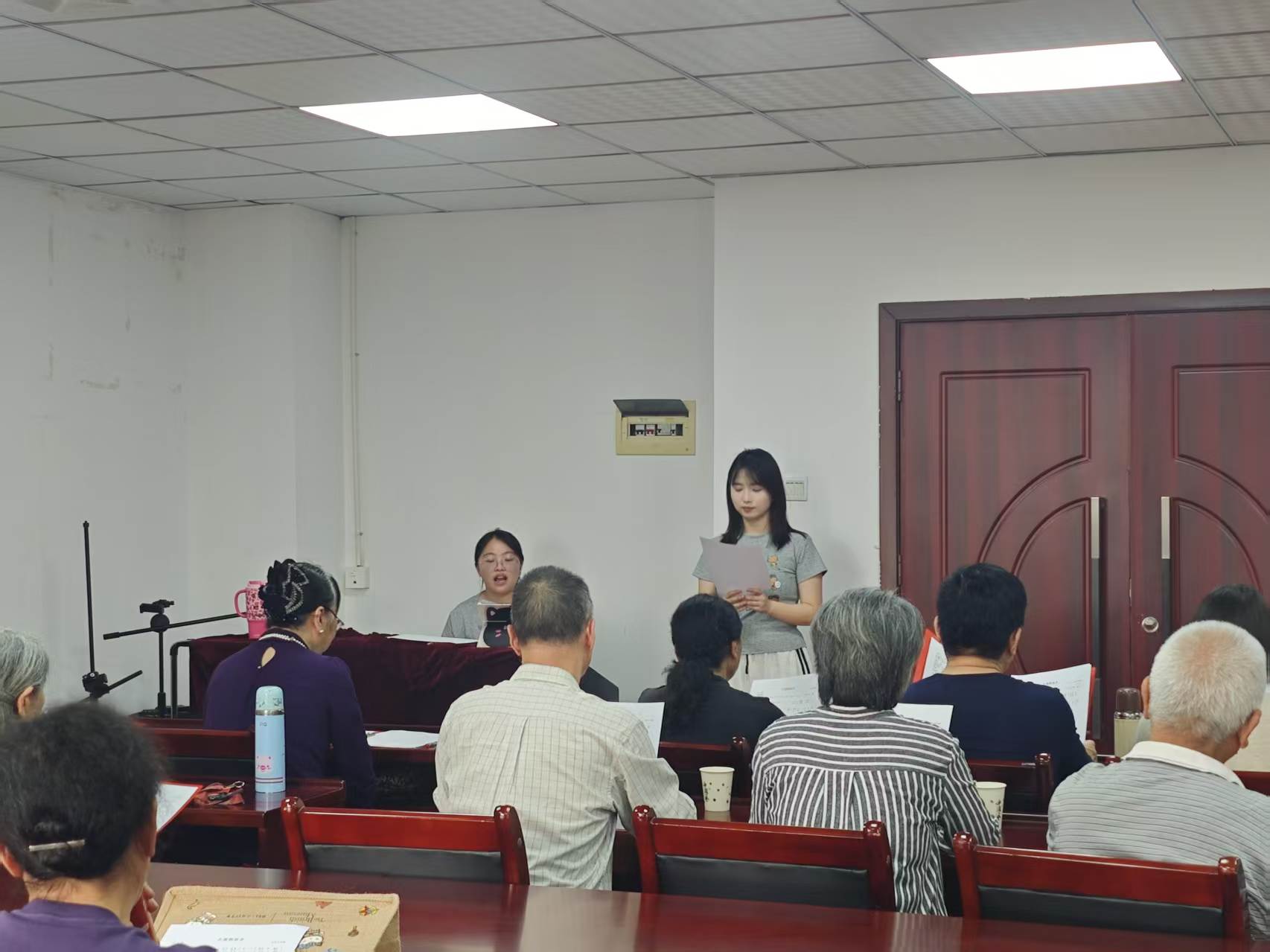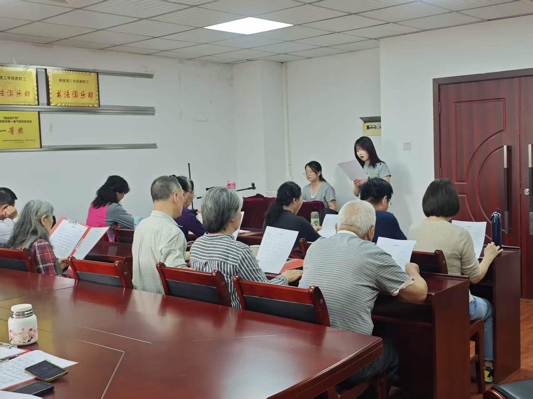 活动现场氛围温馨又热烈,教学者带着十足的耐心与热忱,分工协作、细致教学,一步步带领退休老师们熟悉歌曲旋律、梳理歌词节奏、讲解演唱技巧。从分句教唱到完整跟唱,从音调把控到情感表达,大家细心指导、耐心示范,逐一纠正演唱细节,用温柔的语气、专业的教学,让零基础的老师们也能轻松跟上节奏。退休老师们也精神矍铄、认真学习,跟着旋律轻声哼唱、反复练习,眼神里满是对音乐的热爱与专注。