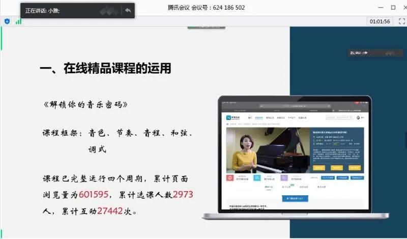第七个发言的是理论教研室的肖雅老师。她是任教音乐学专业2018级3、4班的《视唱练耳》课,这是一门理论教学与实践互动紧密结合的作曲技术理论课。为了使线上教学效果能尽量与传统授课方式的教学效果靠拢,她运用了自己2019年上线,2020年获批省级精品课程精品课程平台——学银在线《解锁你的音乐密码》,以及采用了美国一个特别出色的直播平台zoom来进行线上教学。(zoom平台的优点:网络流畅、功能齐全;缺点:收费。每月360元。)目前来看,教学效果还是不错的,只是因为设备和网络技术的局限性,多声部相关教学存在技术问题,教学形式还在摸索中;个别学生自主学习能力有待提高。
