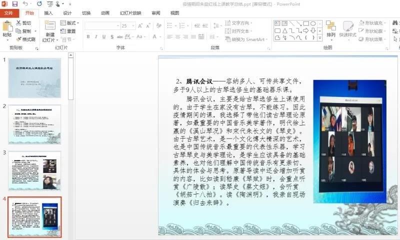 随后器乐教研室的朱益红老师和周力老师分别从各自的古琴、二胡专业出发分享了自己的线上教学体会。朱老师说她的古琴课堂共有9种课型,一周14节课,共38个主、辅修学生;因此,她根据课型特点分别选取了直观、便捷的微信视频用于低于9人以下的主修生小组课堂或1人小课堂;选取了可容纳多人、可传共享文件,腾讯会议——多于9人以上的选修生的课堂。经过了八周的线上教学,她发现线上教学虽然会因为网速问题和音质问题而部分影响到教学质量,但这种直观灵活的教学方式也是一种全新的体验。
