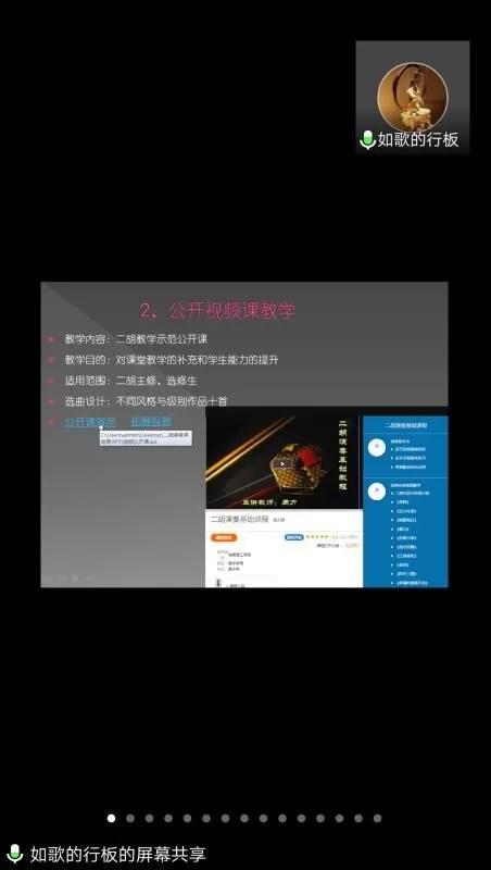 同样是上器乐技法课,周力老师则是根据二胡的专业特点与学生在家有无乐器的实际情况,一方面运用他之前已建好的课程平台(2025年立项、2019年完成验收上线的校级精品视频公开课程《二胡名曲演奏与教学示范》);另一方面整合他自己积累的教学资源和研究素材,在家中制作系列录播课,完成了与基础器乐课程同步教学的胡琴理论课。其中,他的线上课程视频教学和公开视频课教学这两个平台是相互可以调用和补充的,这样就完成了一个线上线下混合式教学的完整过程。由于课程素材大部分来自于周力老师自己演奏或者实地考查的,所以学生们学习兴趣很浓,学起来也比较轻松愉快的。