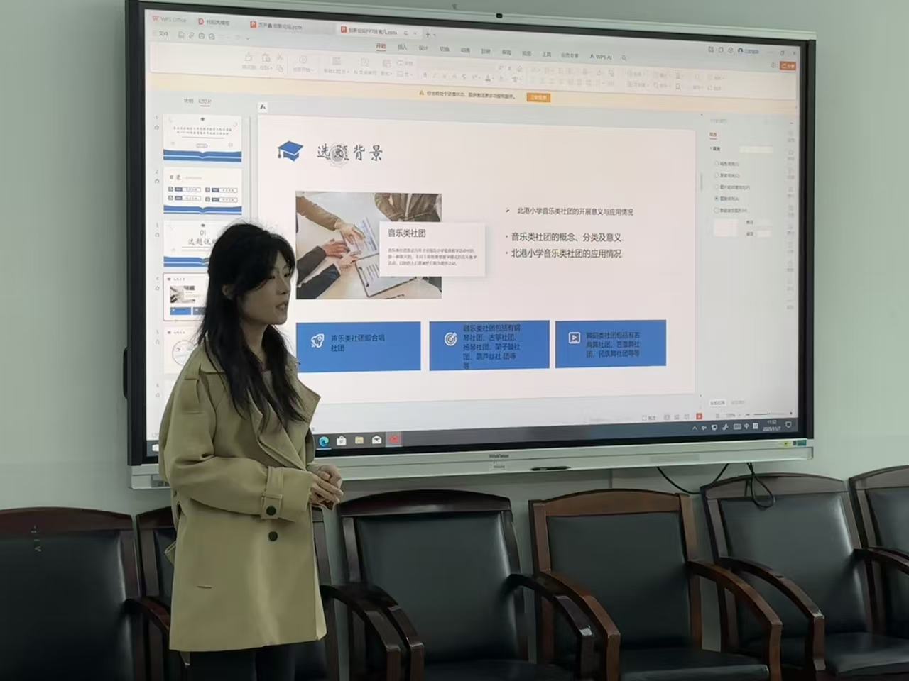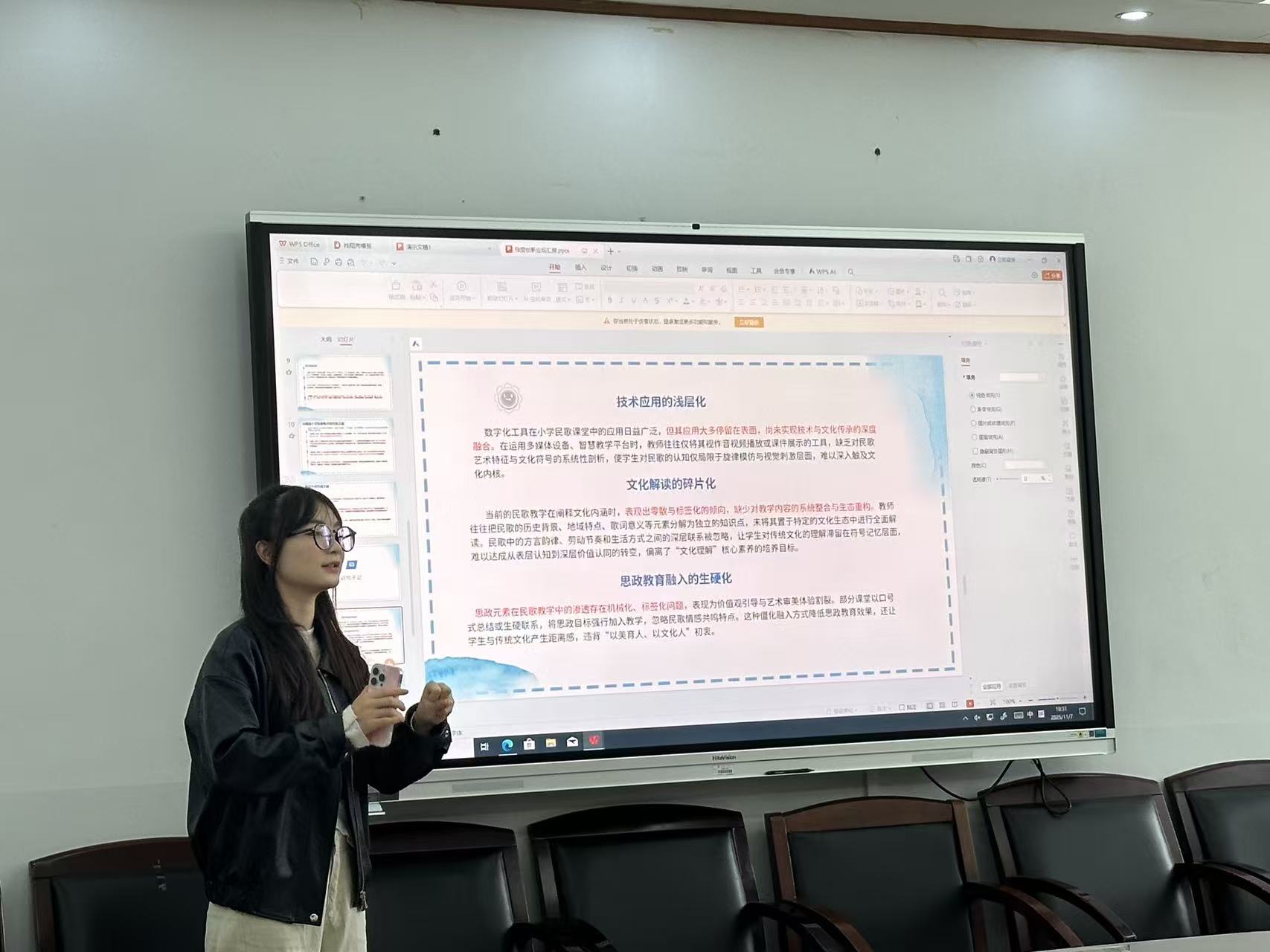 论坛现场成果丰硕,兼具学术深度与实践温度。学子们踊跃分享创新观点:提出“先体验后概念”教学模式,通过分段律动嵌入等互动设计,让学生在节奏游戏中直观理解音乐专业概念;AI技术赋能成为热门方向,从小学民歌教学中利用AI还原民族文化场景,到AI工具课堂实操应用,为传统音乐教育注入数字化活力;洞庭渔歌文旅盲盒设计创新性融合非遗音乐与潮流消费,平江皮影戏校园创新实践以“传承人进校园+学生参与推广”为核心,探索非遗活态传承新路径。