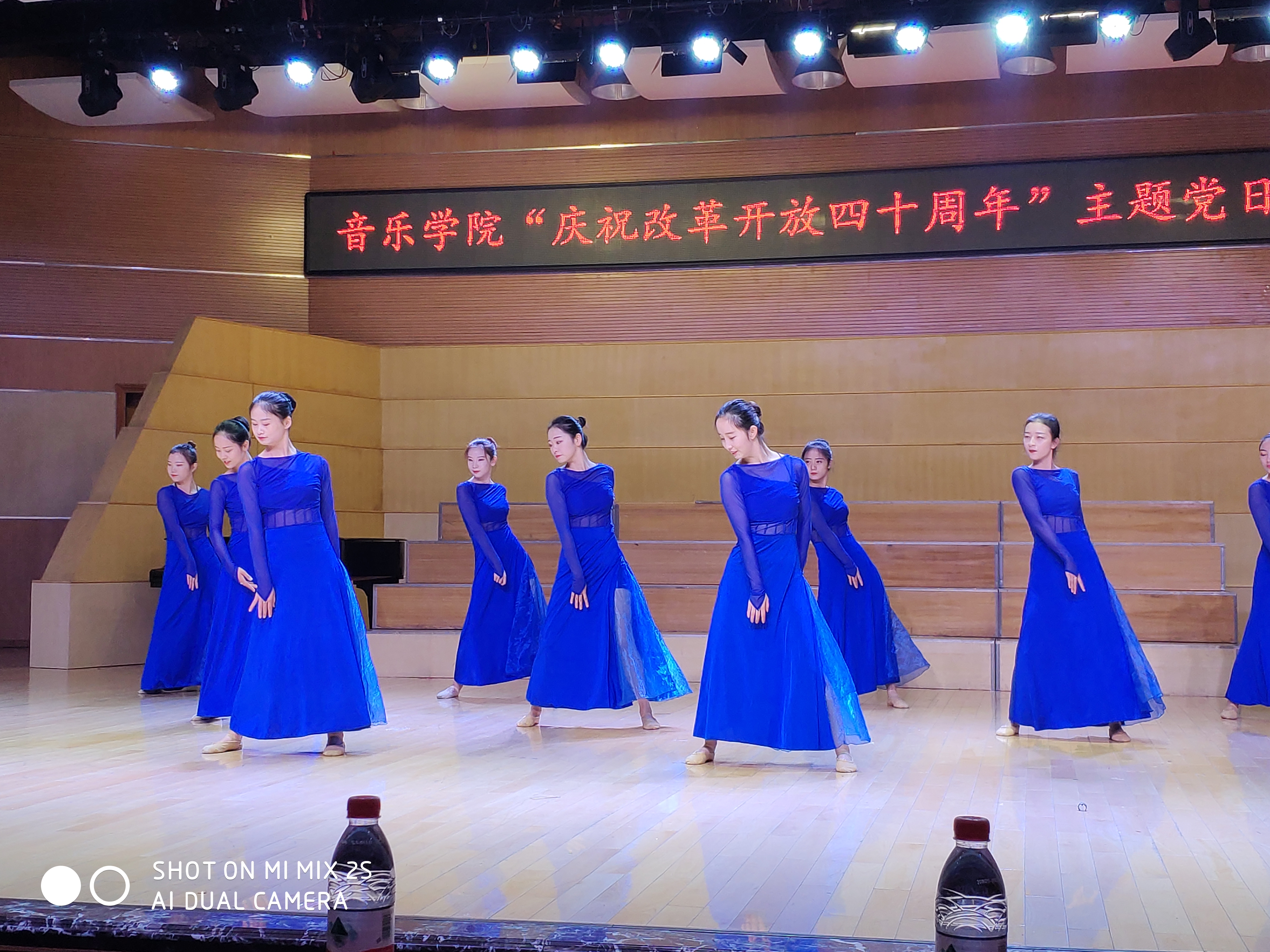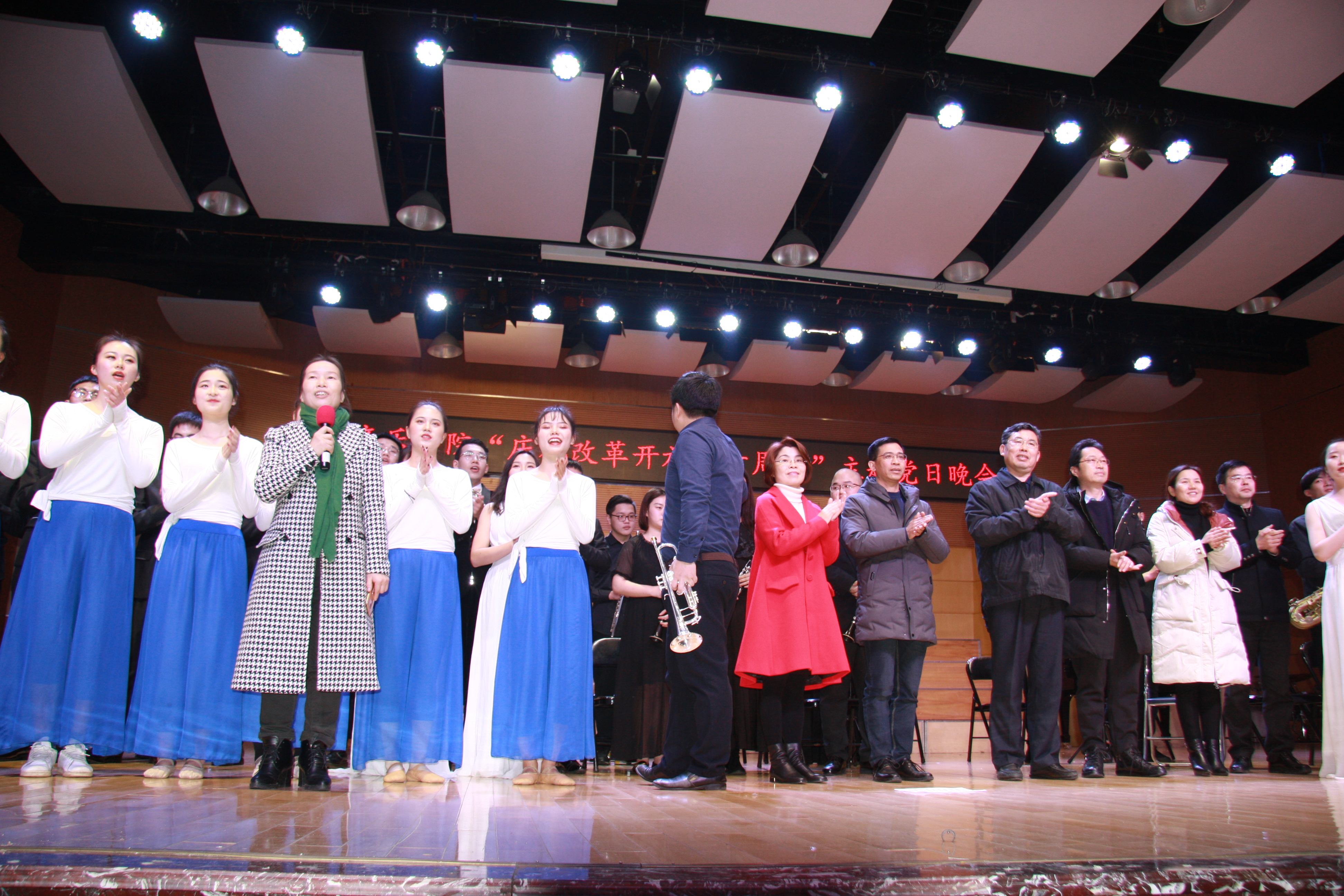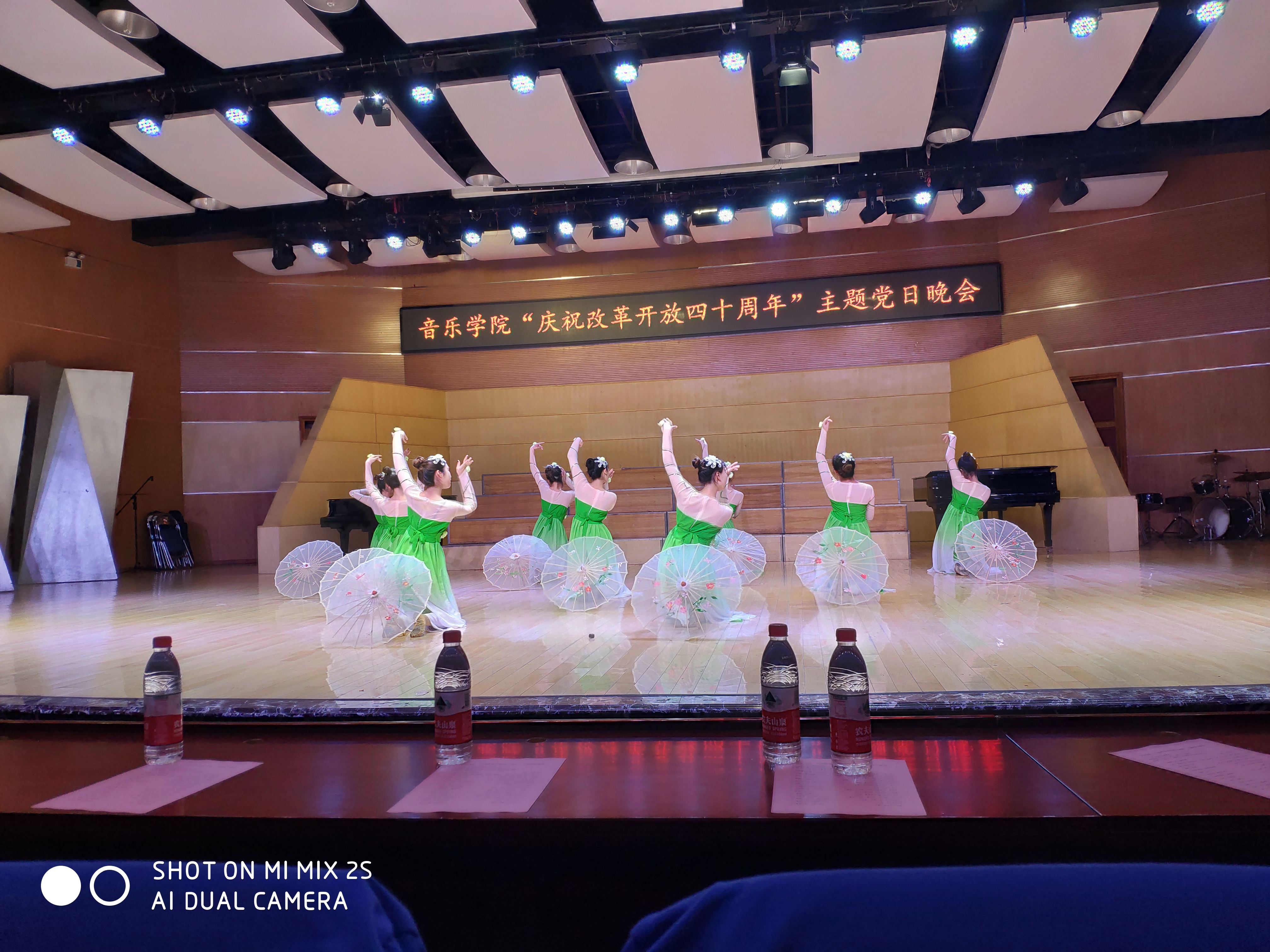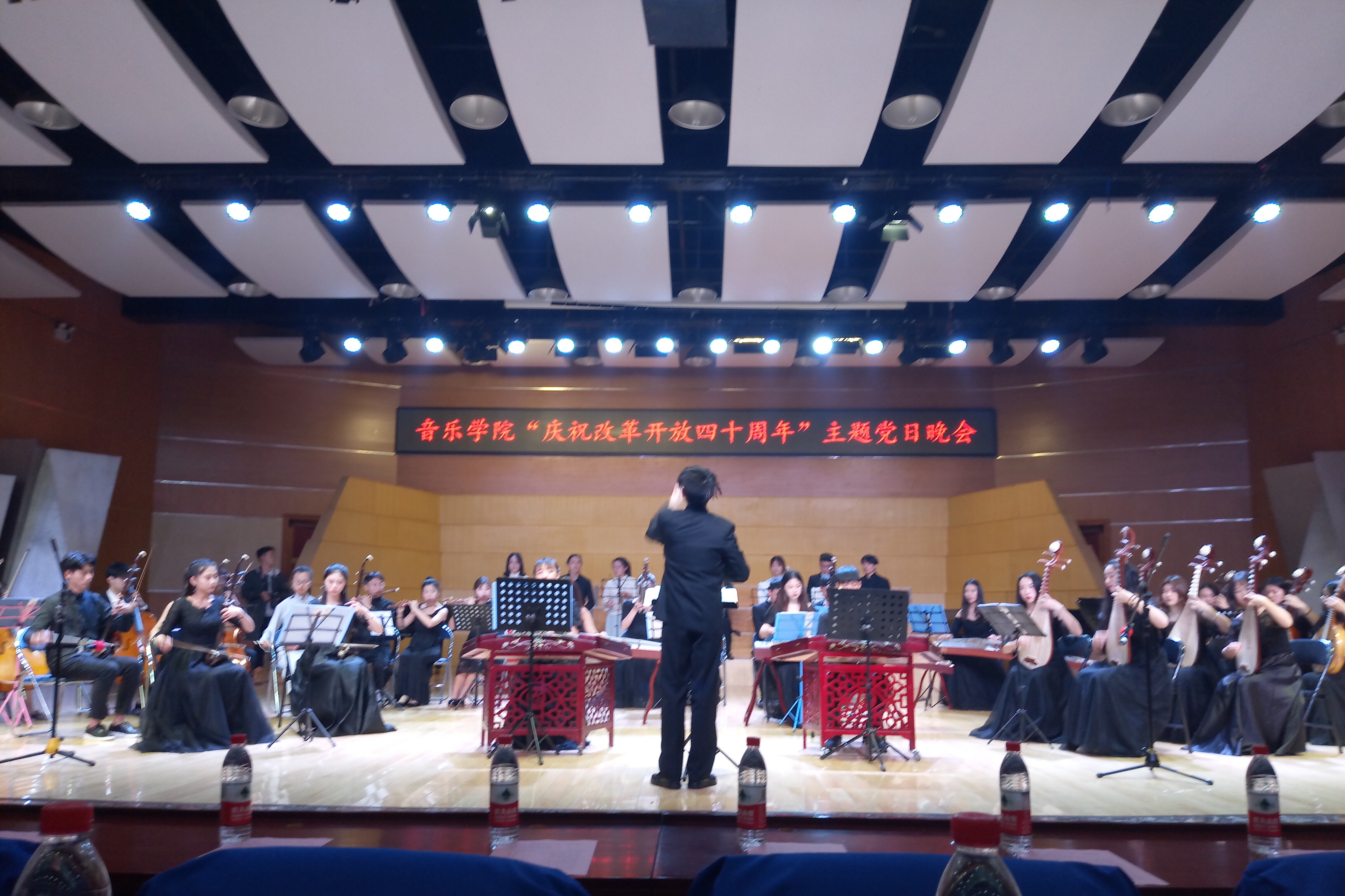 本次晚会一共有14个节目,在院党总支的协调下分别由两个教工党支部、两个本科学生党支部和一个研究生党支部提供,节目形式涵盖了独唱、对唱、合唱、钢琴四手联弹、民乐独奏、合奏、舞蹈等,广大党员教师、党员同学,入党积极分子、研究生会干部、团学会骨干近140人参加了演出或剧务工作。晚会以一场气势恢宏的民乐合奏《金蛇狂舞》拉开帷幕。在管乐合奏《走向复兴》中达到高潮,最后,全场起立齐唱《走向复兴》,本次“庆祝改革开放四十周年”主题党日晚会圆满结束!40年弹指一挥间,40年奋发图强中,我们在磨难中成长,我们在改革中壮大,我们在40年的华表上昂首挺立,我们在40年的旗帜上飘扬奇迹!愿我们的祖国更加繁荣昌盛!