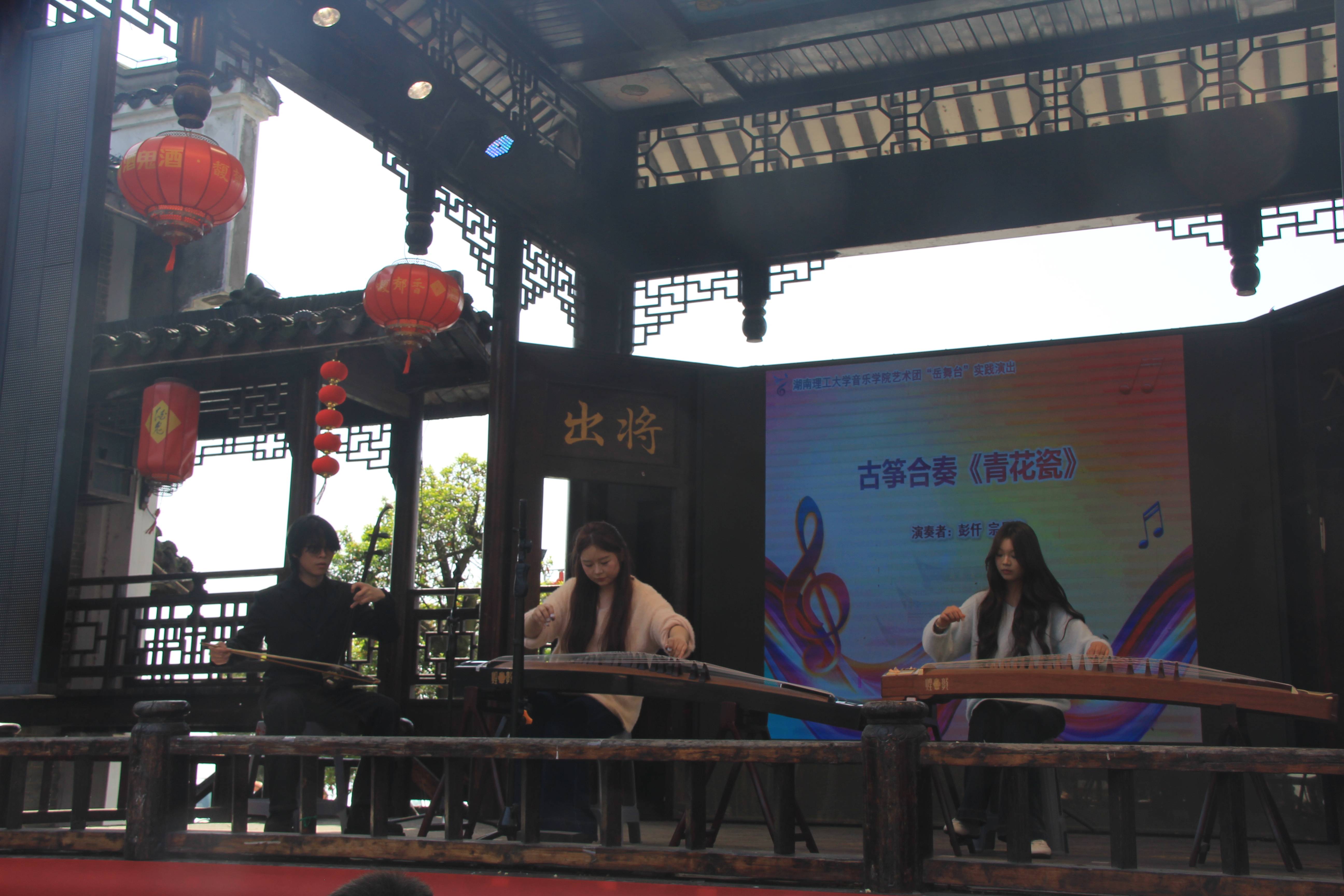 本次演出以实践教学为核心,精心遴选16个优质节目,涵盖声乐独唱、器乐独奏、民乐合奏等多种形式,《火把节的欢乐》《茉莉芬芳》《兰亭序》等多元曲目轮番上演,为现场观众带来沉浸式的艺术体验。舞台上,周梦圆以灵动婉转的嗓音演绎《火把节的欢乐》与《龙船调》,将浓郁的民族风情与饱满的艺术感染力完美融合;徐帅的萨克斯独奏《爱笑的眼睛》《青花瓷》,以细腻娴熟的演奏技法引发观众强烈共鸣;宗丹黎的古筝独奏《茉莉芬芳》《双面燕洵》,指尖流转间尽显传统民族乐器的独特韵味。此外,古筝二胡合奏《兰亭序》、古筝合奏《青花瓷》等节目,更充分展现出学生的跨专业协作能力与艺术创新思维。参演学生凭借扎实的专业功底、从容的舞台表现,生动彰显了学院“课堂到舞台”双轨培养体系的丰硕成果。户外演出的开放环境,不仅有效考验了学生的临场应变能力,更通过直面观众的即时反馈,推动其专业素养实现全方位提升。