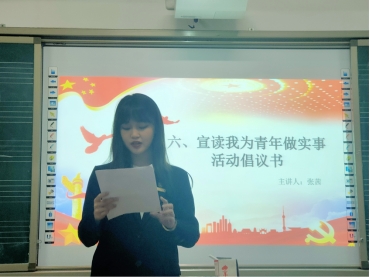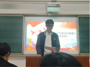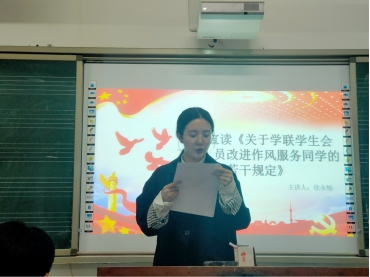 团学分会执行主席简丽娟带领大家学习了《省学联下发的学习资料》并和大家分享了自己在学习上的经验,学生副书记彭俊雄、执行主席徐永畅、学生副书记张茜分别对学生干部作风建设问题警示教育做案例解读、宣读了《关于学联学生会工作人员改进工作作风服务同学的若干规定》和《我为青年做实事活动倡议书》。