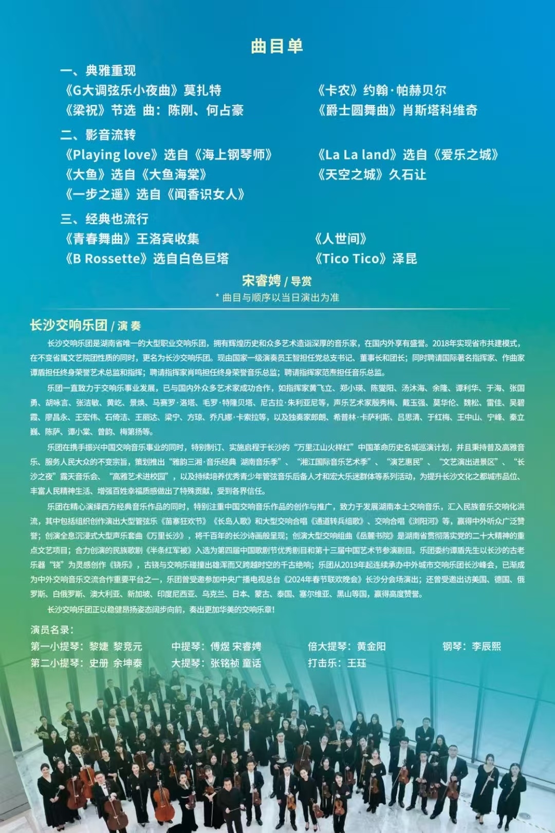 长沙交响乐团是湖南省唯一的大型职业交响乐团,拥有众多艺术造诣深厚的音乐家,在国内外享有盛誉。乐团始终秉持着携手振兴中国交响音乐事业的崇高使命,精心策划并推出了“高雅艺术走进校园”等活动,培养优秀青少年管弦音乐后备人才和宏大乐迷群体等,受到各界广泛的信任与赞誉。