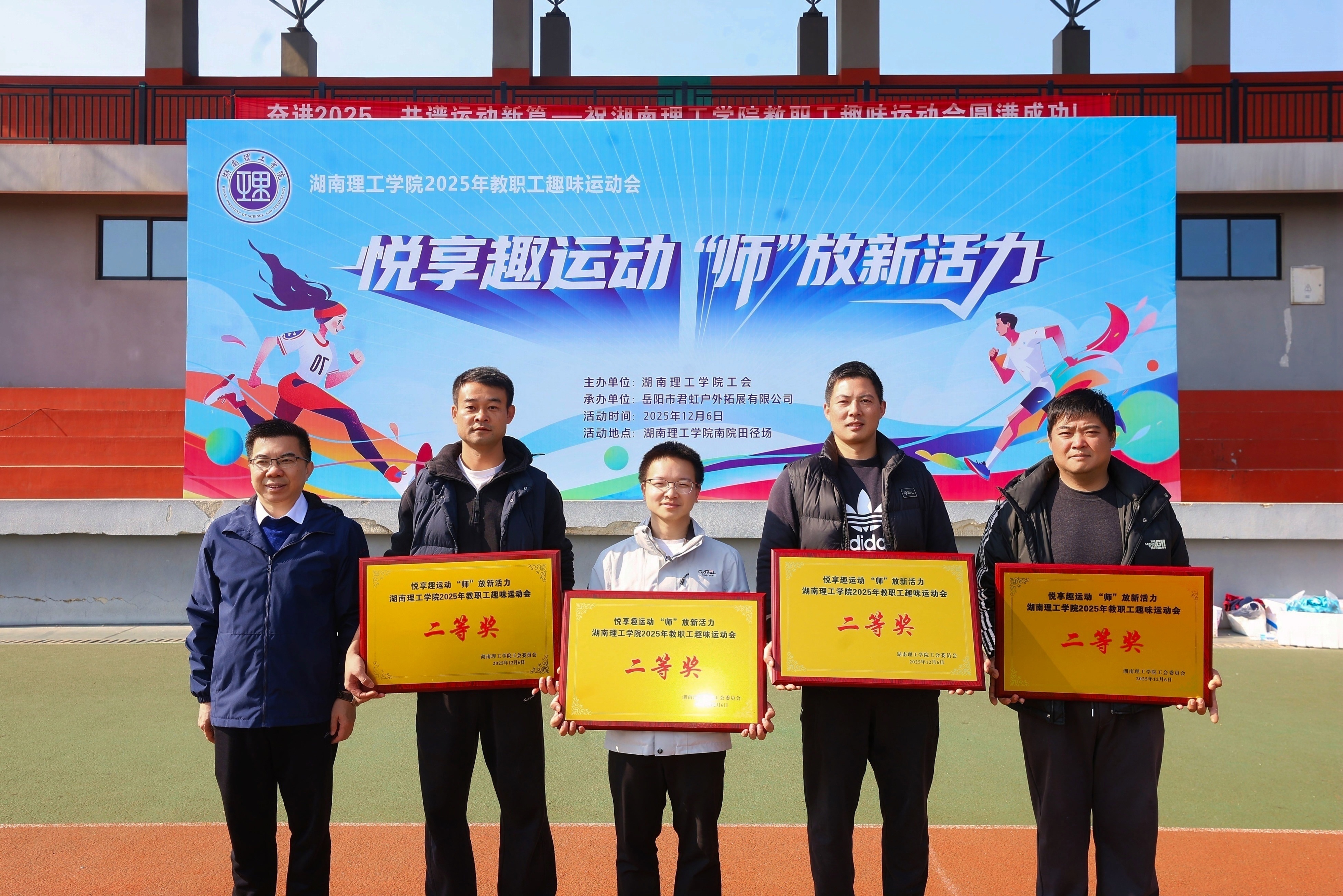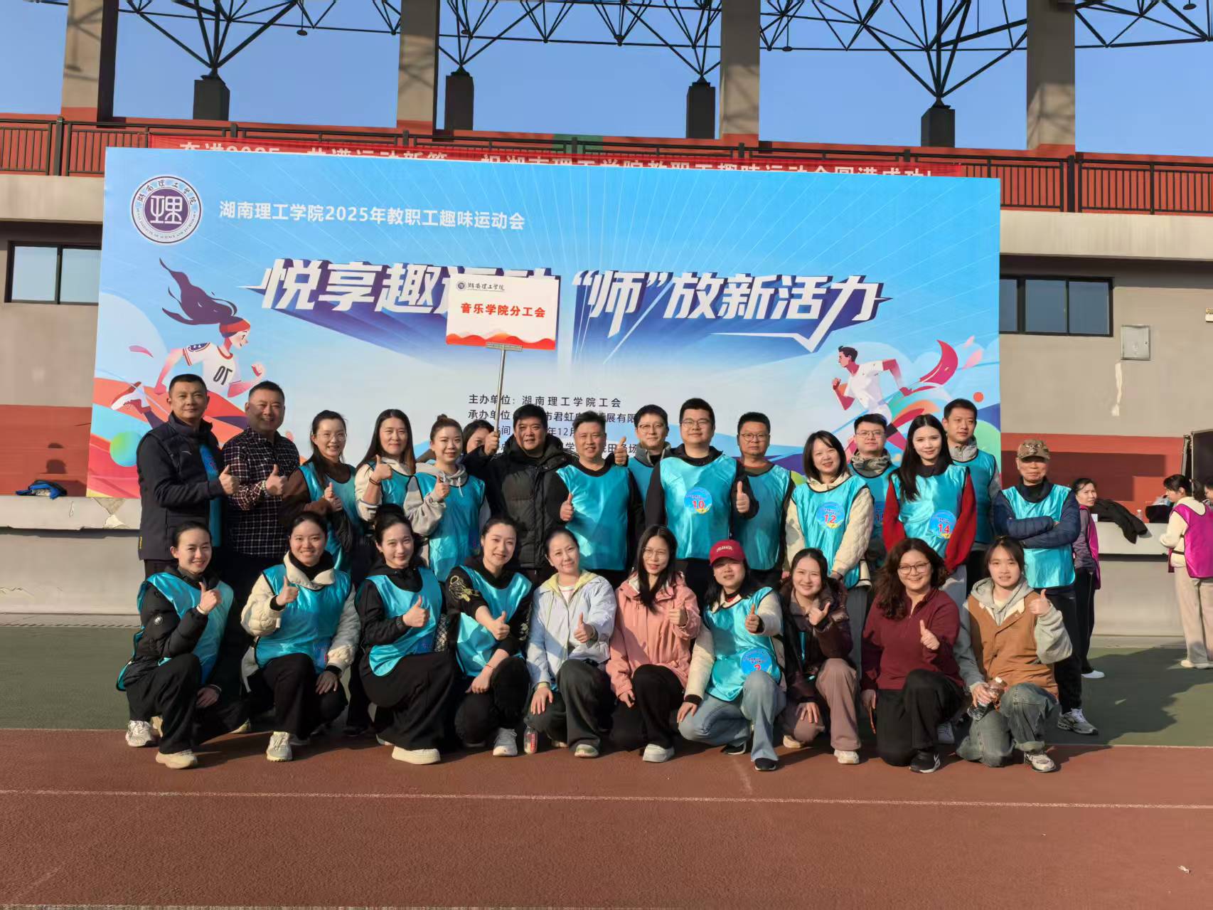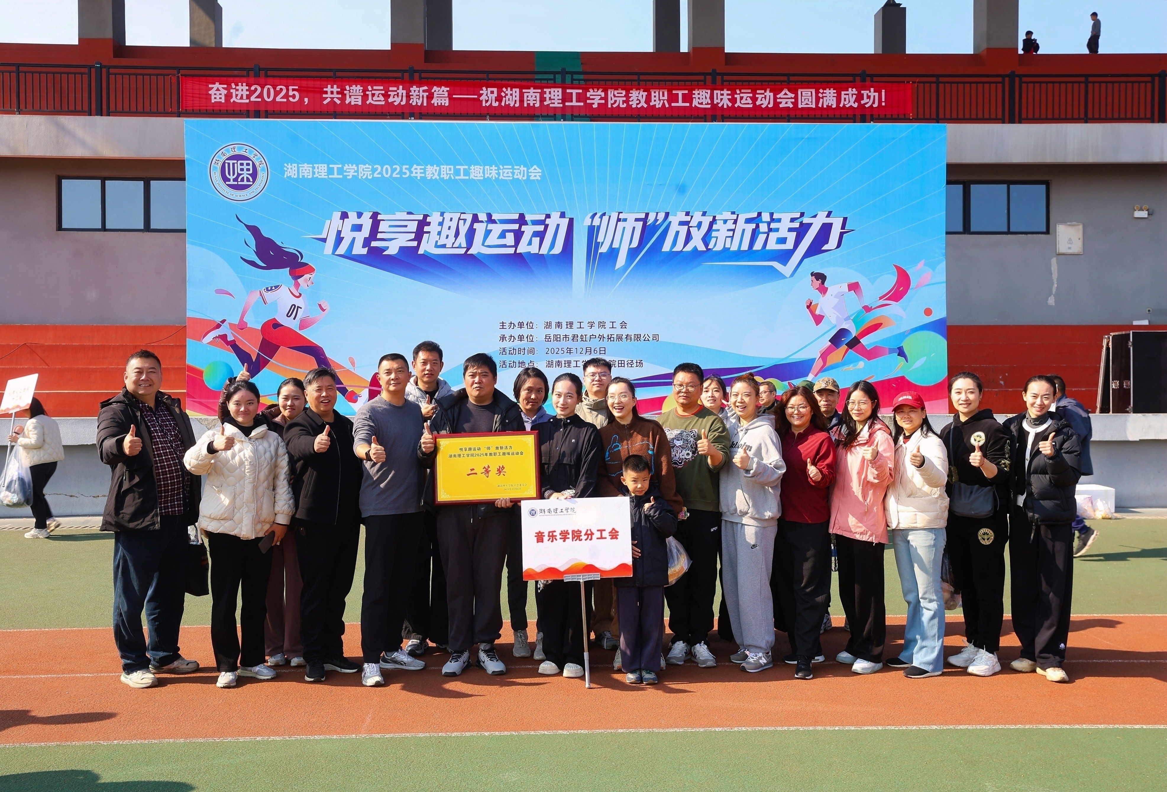 2025年11月6日,304am永利集团南院田径场上口号嘹亮、活力四射。“悦享趣运动 ‘师’放新活力”2025年教职工趣味运动会在此热烈启幕。全校各分工会教职工齐聚绿茵场,在趣味竞技中释放活力,凝聚团队力量。304am永利集团分工会积极响应,精心组织,在“‘音’为热爱,‘体’现精彩”的响亮口号激励下,全体参赛教师团结协作、奋勇拼搏,最终凭借出色的综合表现荣获团体总分第三名,勇夺二等奖,充分展现了学院教职工昂扬向上的精神风貌。
