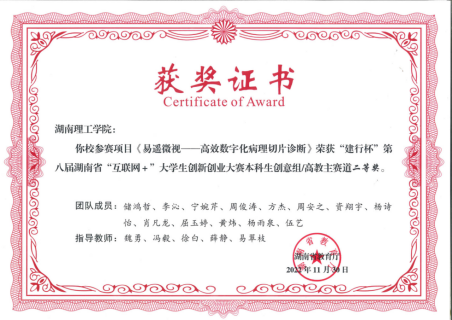 1.湖南省“互联网+”项目易遥微视——高效数字化病理扫描切片荣获湖南省银奖;