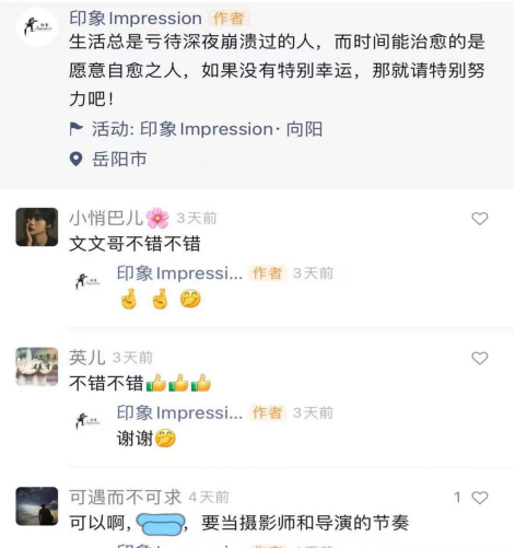 拍完这个微电影我感触颇深,抑郁症和感冒发烧一样,大家不要把它妖魔化,对抑郁症患者不要存在误解与偏见,要多一些理解与关爱,同时我也要对抑郁症患者说,不管时间如何,不要放弃自己,学会爱自己。最后借用电影中的一句台词给每一位在抑郁症中苦苦挣扎的患者“生命中有许多东西可遇不可求,请不要对任何一天怀有遗憾,再黑的夜晚也终会迎来黎明!”