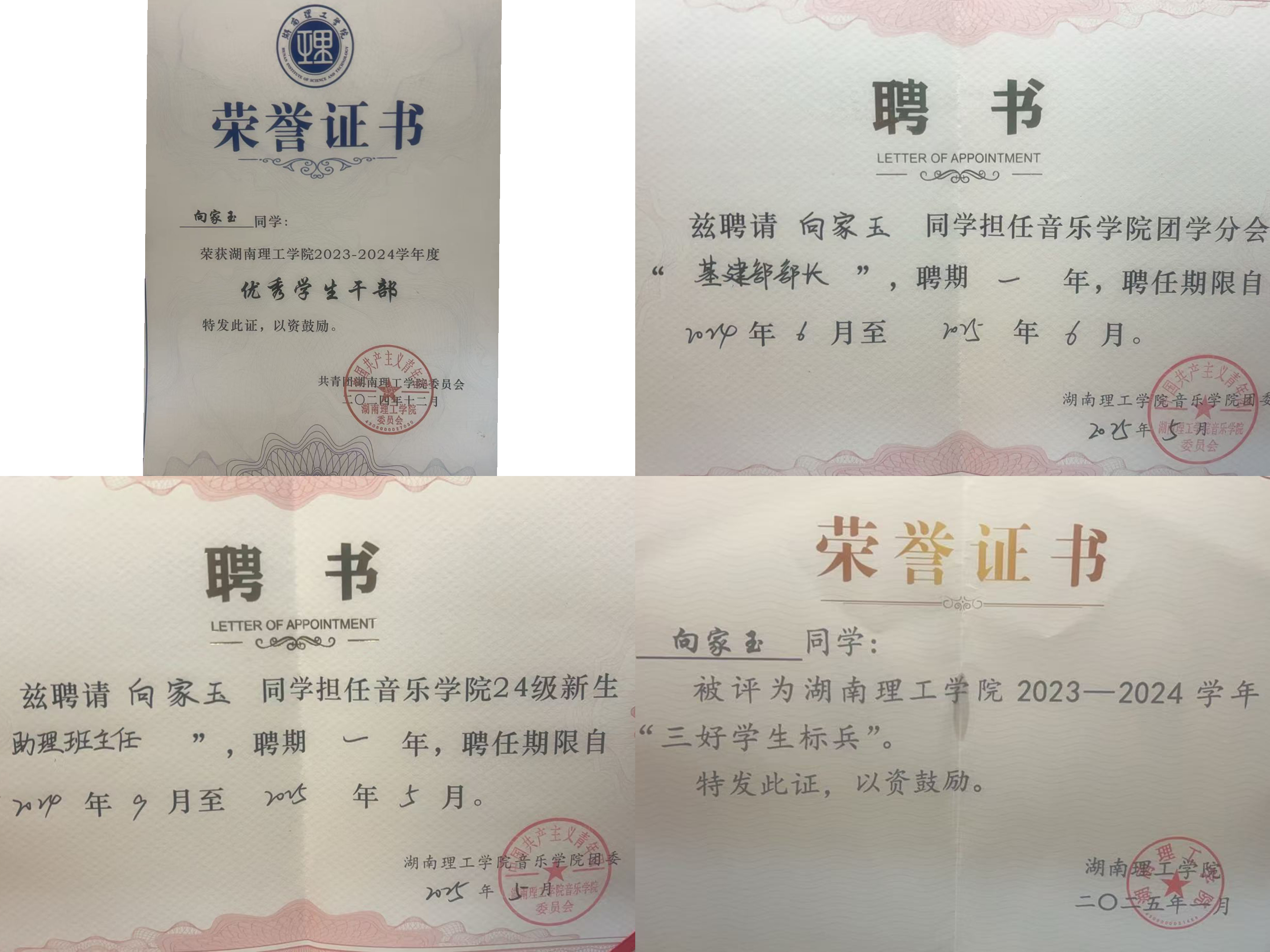 对于在音乐道路上求索的学弟学妹,向家玉同学给出的建议凝聚了他的切身感悟:既要保持清晰的“目标感”,让每日的练习有的放矢;更要“走出琴房”,在丰富的实践舞台上锤炼自己。他作为这一理念的忠实践行者,积极通过竞赛和志愿服务,让音乐技能在社会服务中焕发新的光彩。