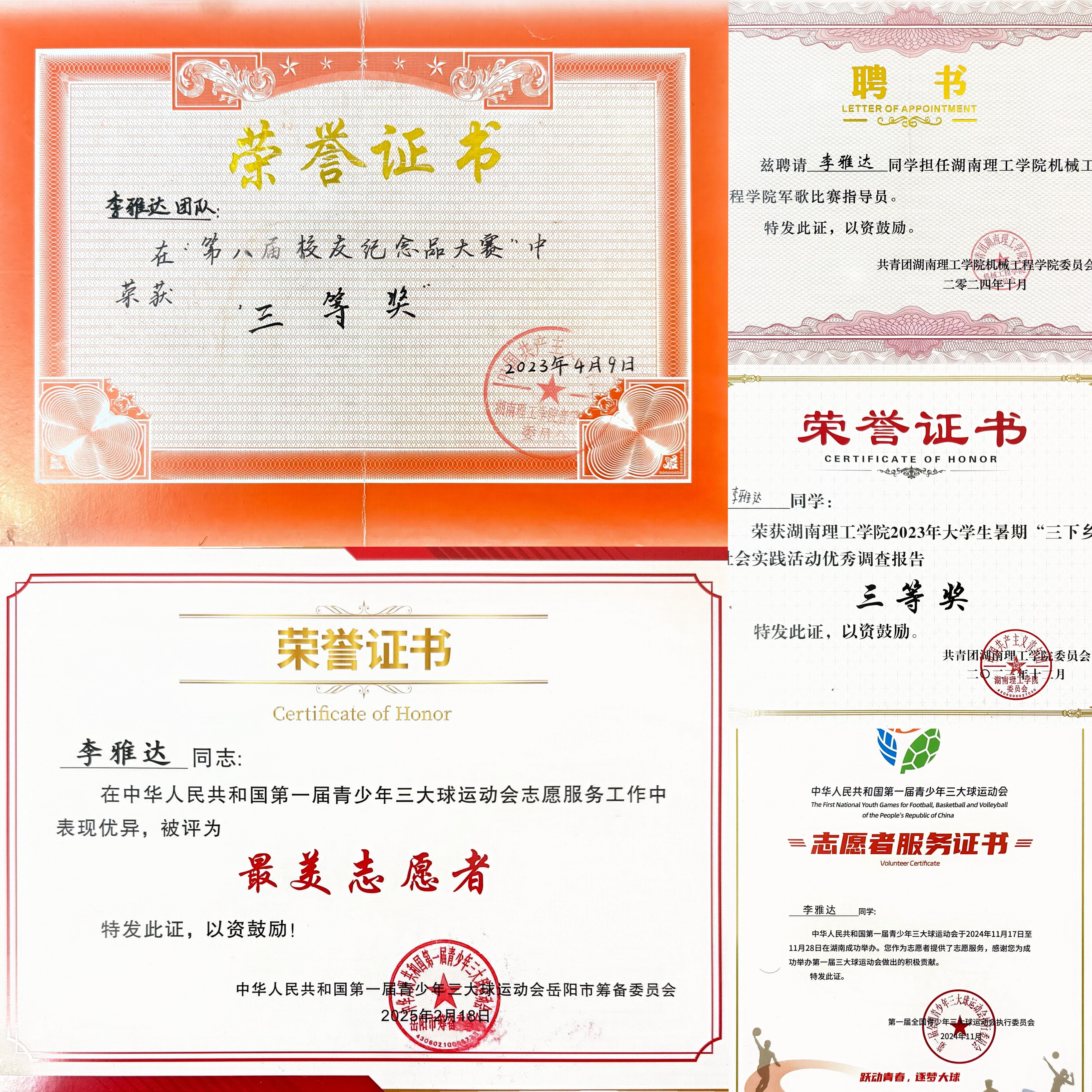生活中的李雅达始终严于律己、以身作则,以先锋模范作用带动身边同学共同进步。他坚持将党性修养融入日常,积极投身“三下乡”社会实践志愿服务、青少年三大球运动会志愿服务等各类实践活动,用实际行动践行青年担当。同时,他主动发挥自身优势,担任其他学院军歌比赛指导员,助力校园文化活动开展,先后斩获三好学生、优秀共青团员、优秀青年志愿者等多项荣誉称号。他以热忱之心对待他人,以执着之志坚守初心,在志愿服务与集体生活中不断丰富人生阅历,为青春增添了厚重的奉献底色。