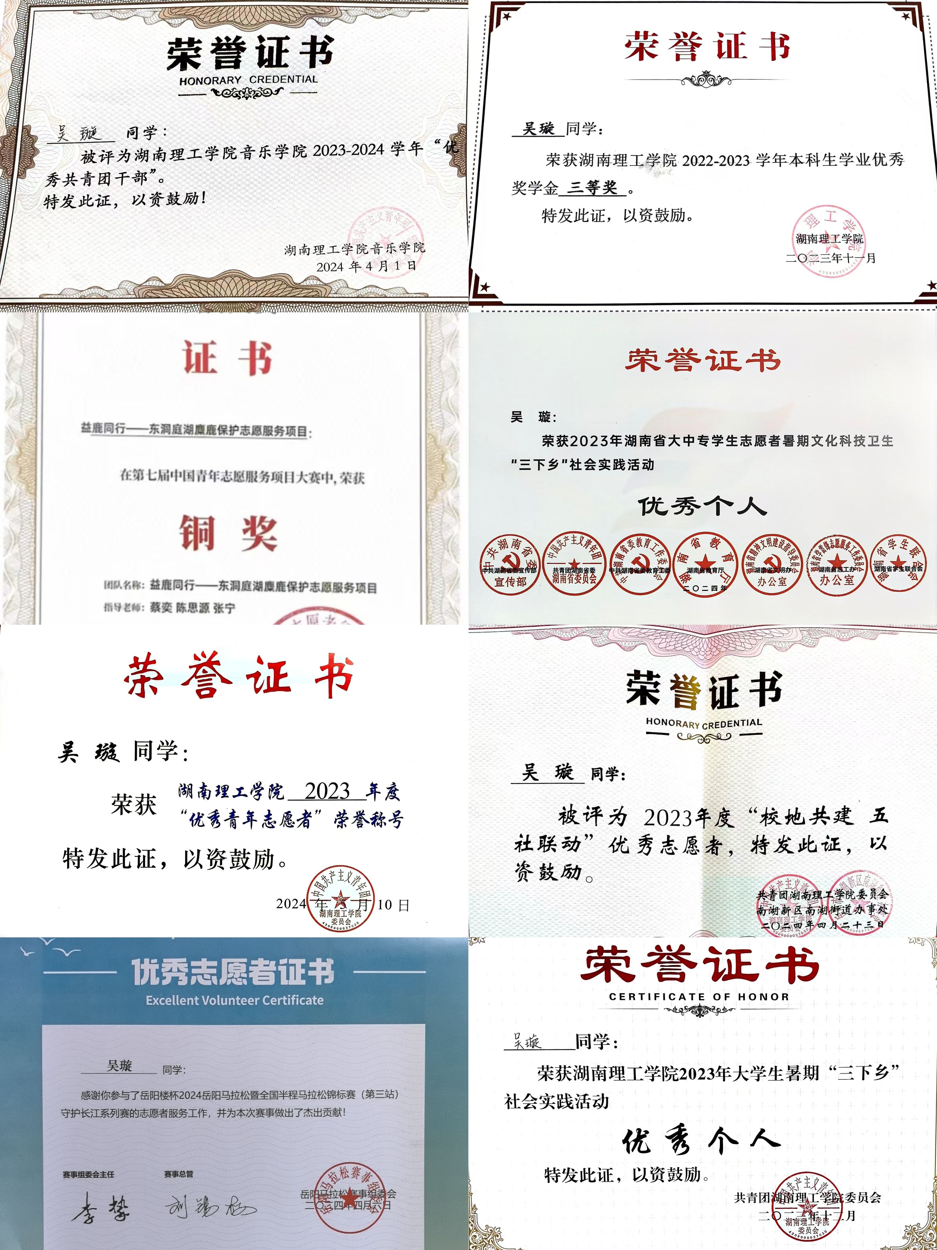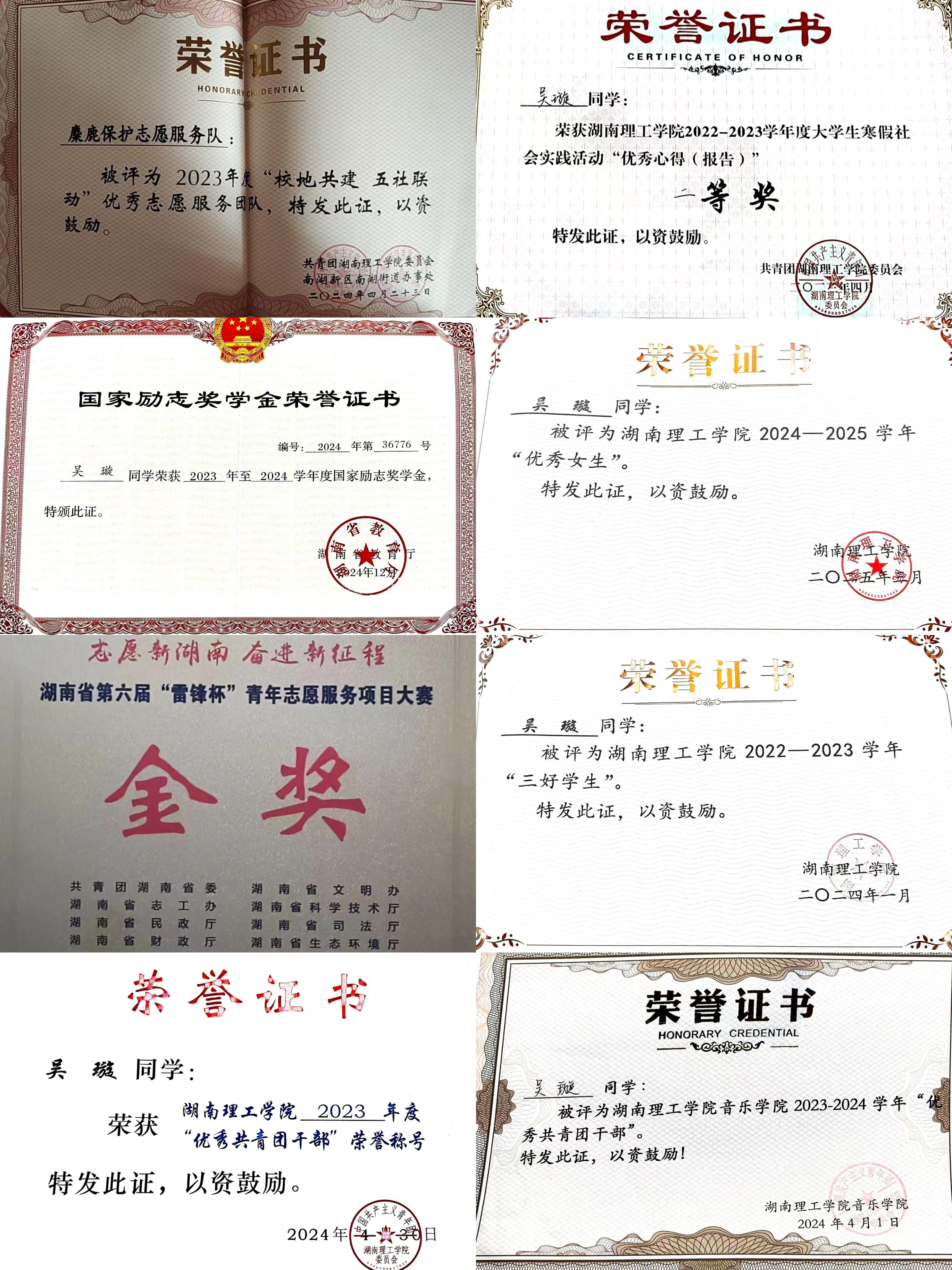 学业与实践并行,成长与荣誉相伴。吴璇连续两年斩获国家励志奖学金,荣获校级本科生学业奖学金;个人综合素质全面发展,先后获评“优秀女生”“三好学习标兵”“优秀共青团干部”“三好学生”“优秀青年志愿者”等多项荣誉称号。实践心得屡获佳绩,两次分获校级寒假社会实践“优秀心得(报告)”一、二等奖,两次获评省、校级暑期“三下乡”社会实践优秀个人,用实打实的成绩证明“实践与学业可以双向奔赴”。