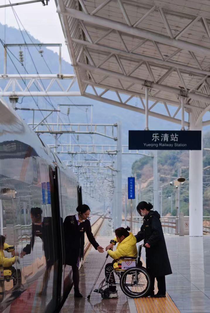 两位铁路工作人员正耐心陪伴着一位坐轮椅的旅客,