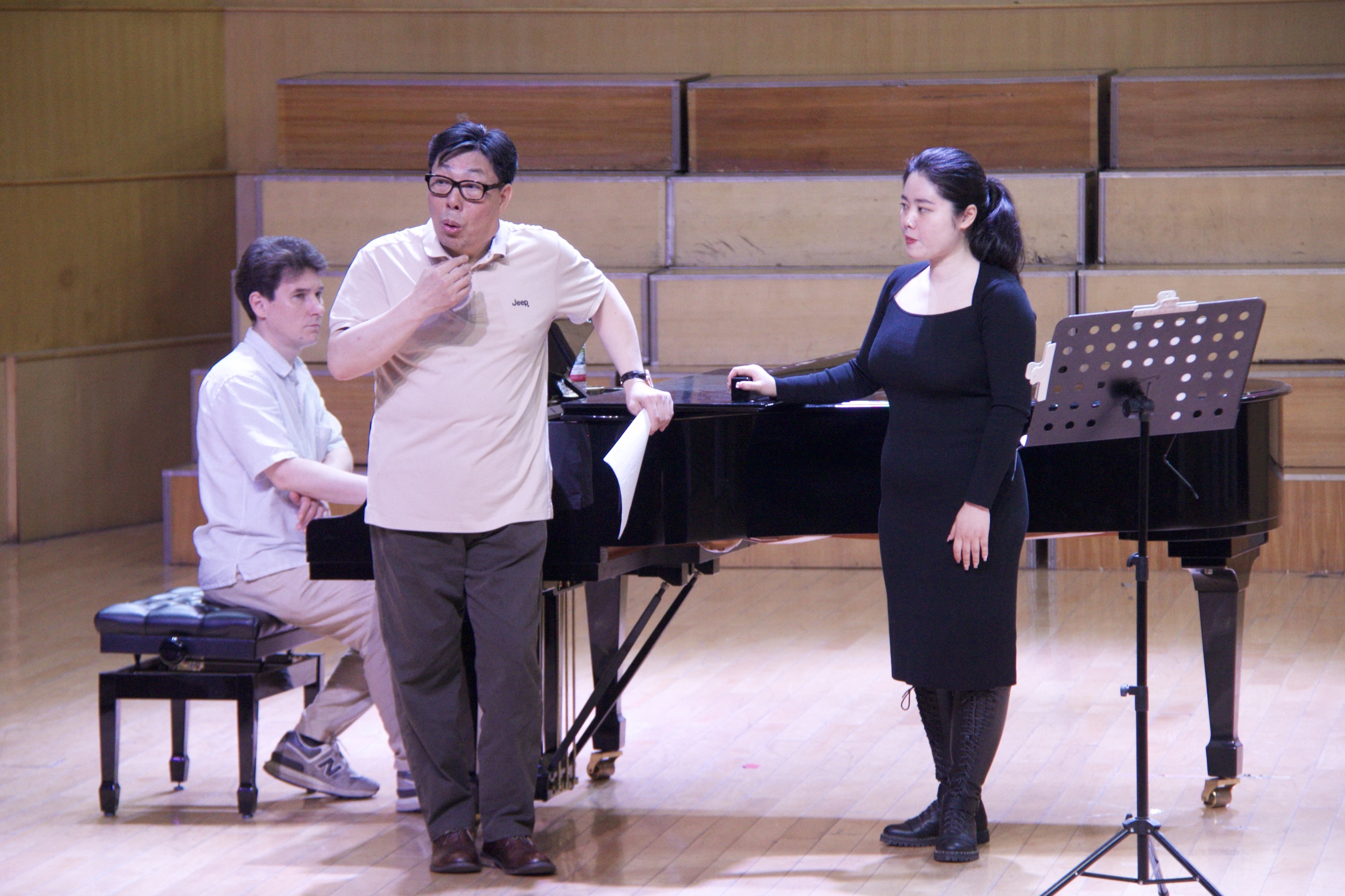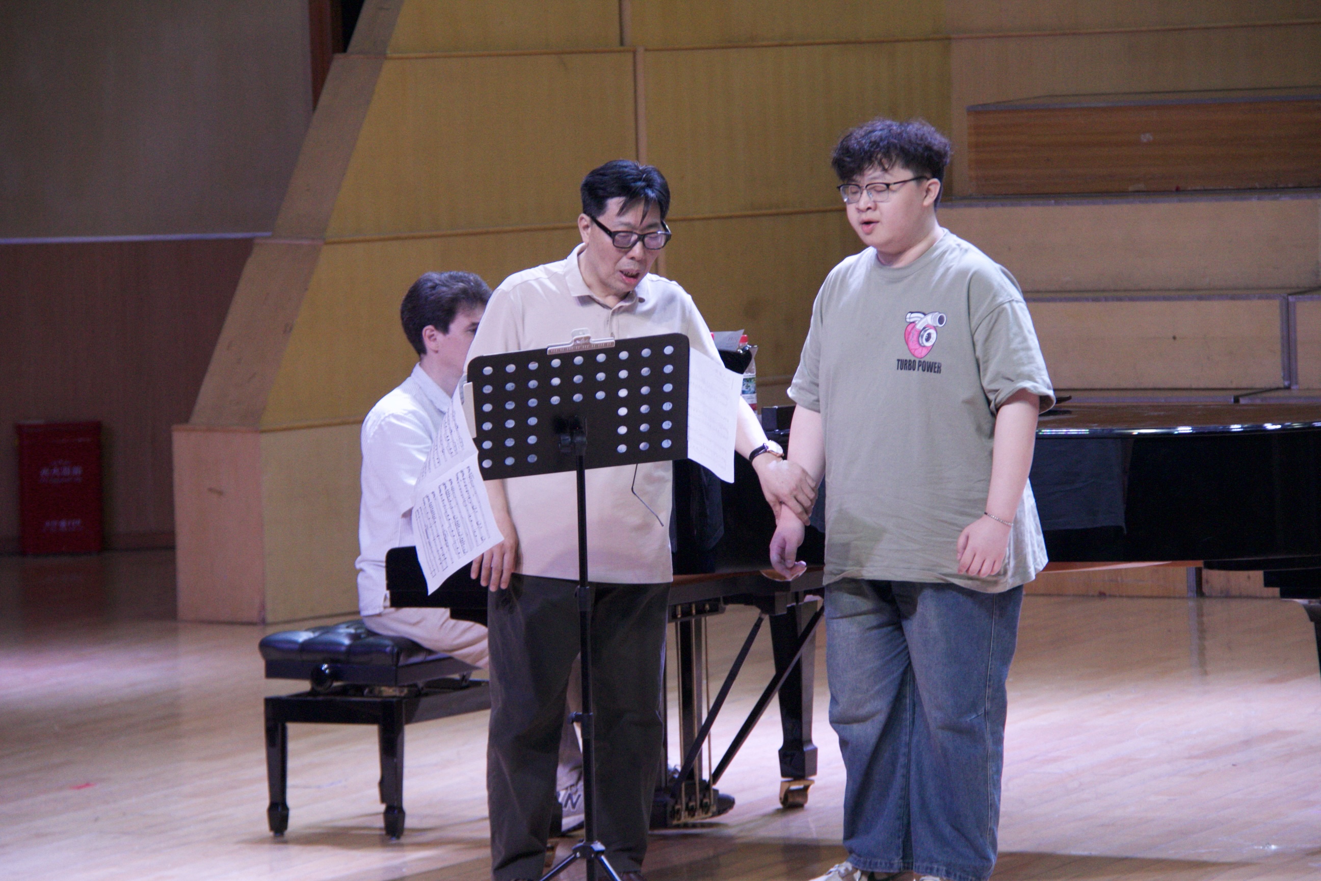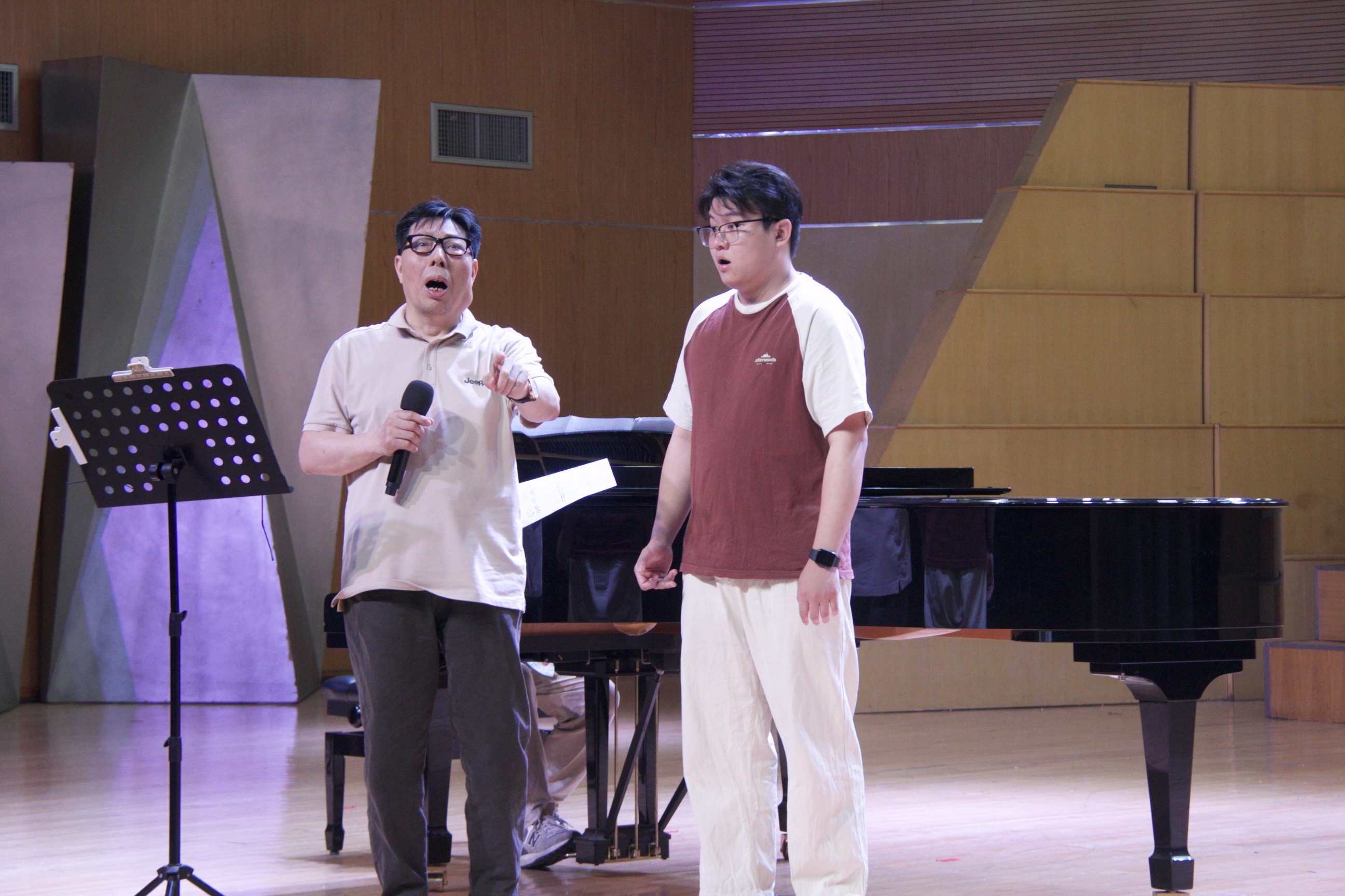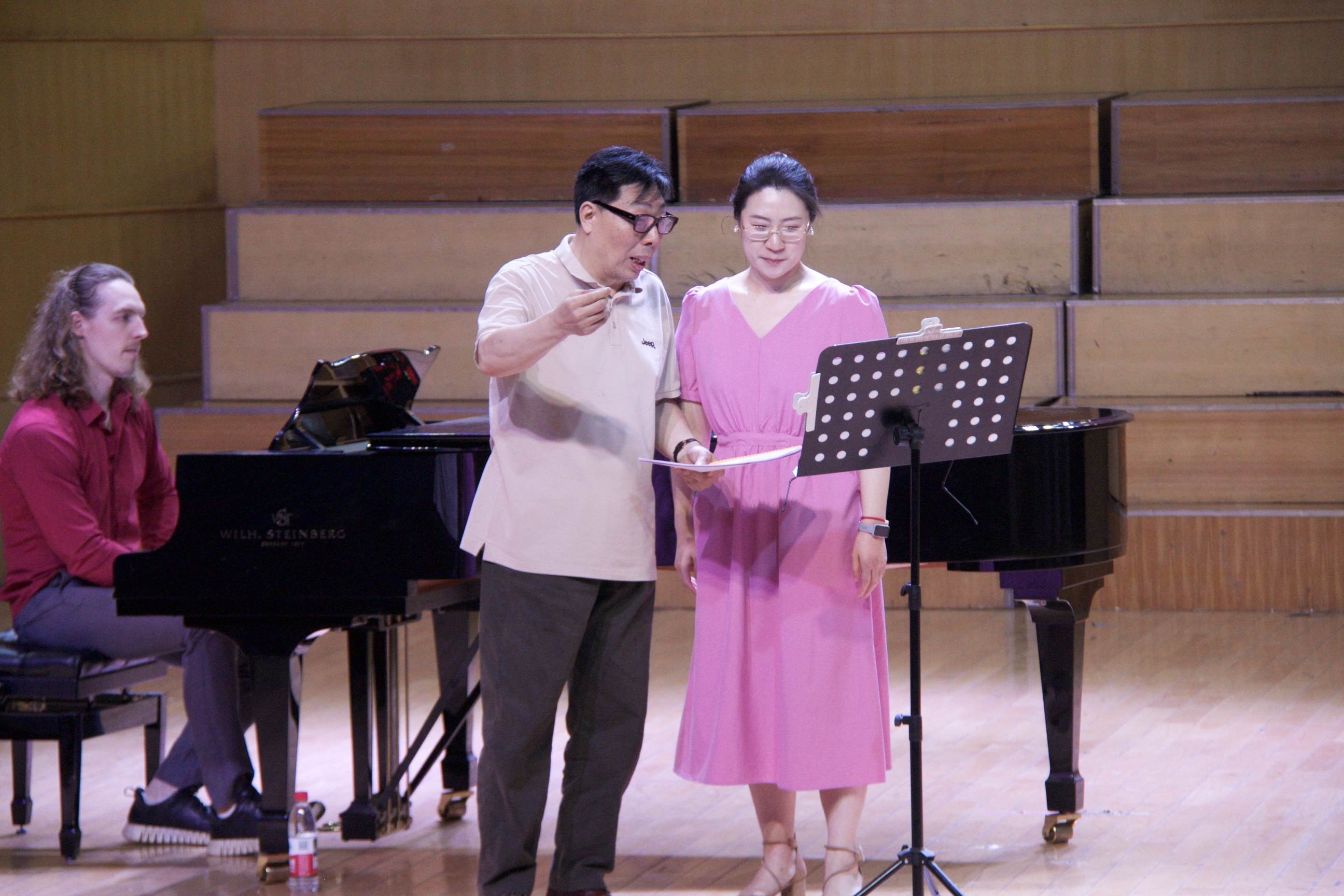在互动环节中,赵小平教授对学院青年声乐教师与声乐表演学生进行一对一指导。针对美声唱法演员,他纠正意大利语歌词的咬字偏差;指导民族唱法演员时,则强调方言韵律与科学发声的结合。赵教授反复叮嘱“基本功决定艺术高度”,建议通过诗词朗诵强化语感,利用哼鸣练习打磨声音连贯性。
