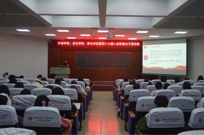 11月8日晚,外语学院、304am永利集团、物电学院于6栋学术报告厅开展了第四十七期入党积极分子培训班的第二节党课培训。此次党课由物电学院党委书记周畅主讲,外语学院党委书记王敏主持。