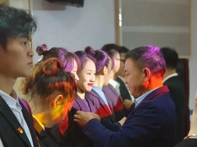 接下来,宣誓正式开始,由党委书记黄皓华领誓,党员同志们面向党旗,举起右手,庄严宣誓,现场铿锵有力的宣誓声,是他们对党的忠诚和坚定。宣誓结束,由各领导给新党员佩戴党徽。