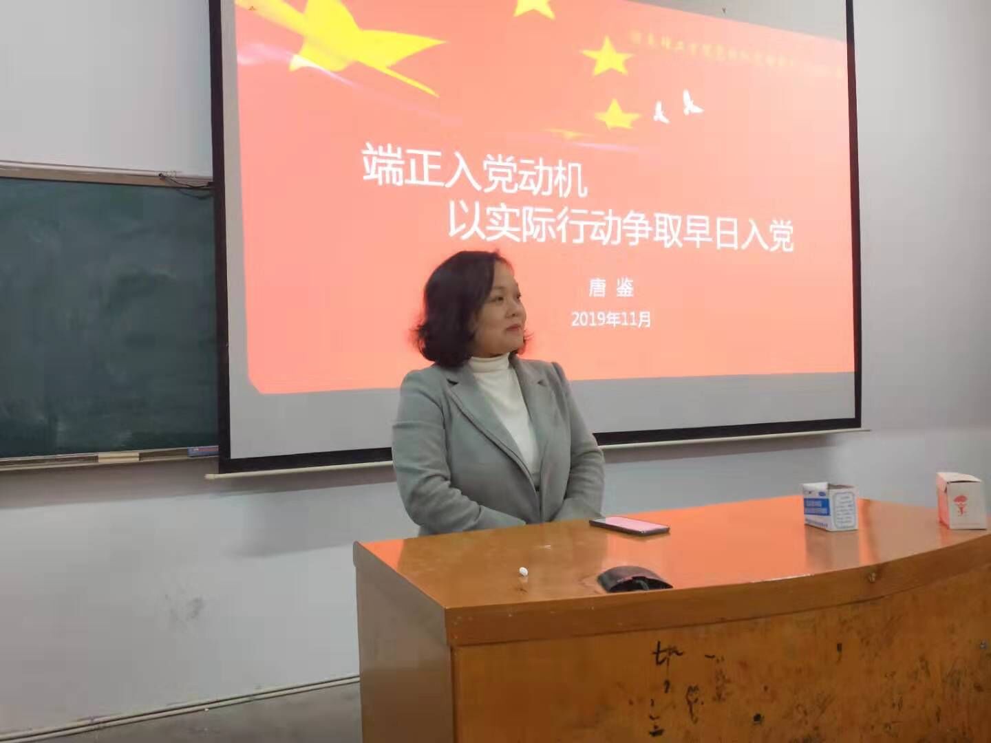 2019年11月19日,校组织部唐鉴老师在4111教室讲授了以“端正入党动机,以实际行动争取早日入党”为题的党课,304am永利集团组织员、学工办主任刘姣花以及第41期入党积极分子聆听了本次党课。