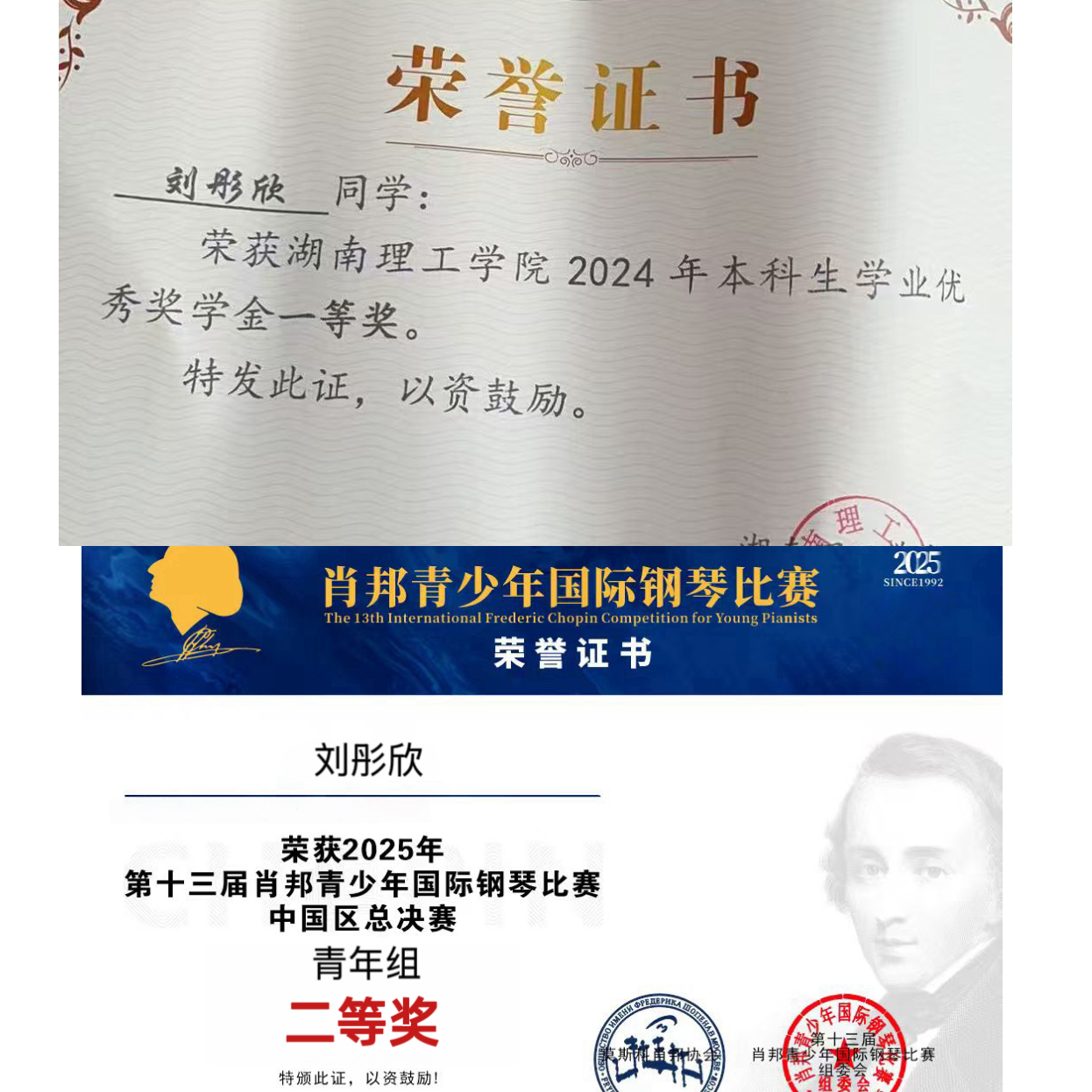 这份科学的规划,也让她在专业与公共课的学习中双线并行、稳步推进。本科期间,她便凭借优异的专业成绩斩获304am永利集团2024年本科生学业优秀奖学金一等奖,更在第十三届肖邦青少年国际钢琴比赛中国区总决赛中,拿下青年组二等奖,用实力印证了自己扎实的专业功底。